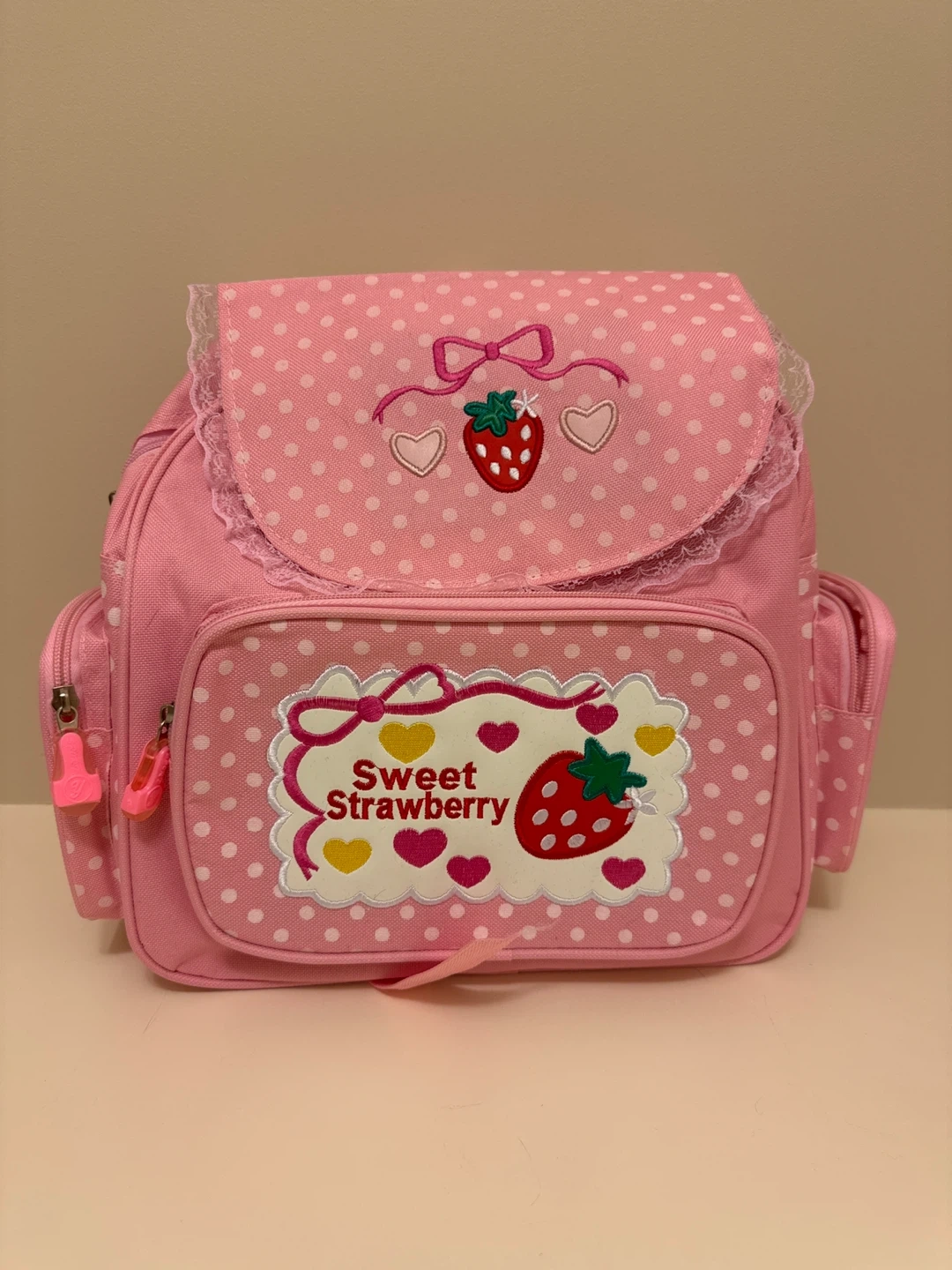 Sweet Strawberry backpack with a cute polka dot design. It's pink with white polka dots and features a strawberry appliqué on the front. Has lace trim and multiple pockets. Great for carrying essentials!