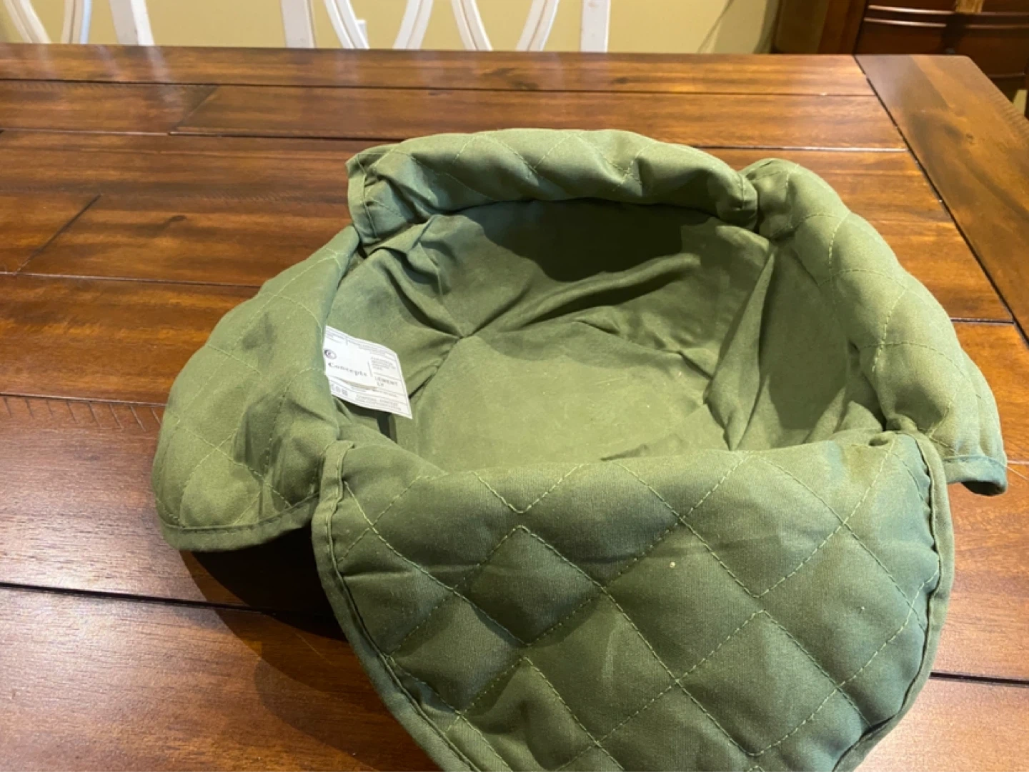 Ashuley Bread basket-A quilted bowl cozy featuring a kitchen theme with wine bottles and vegetables. It's made with a green outer fabric and a patterned inner fabric. The bottom is a woven straw material.