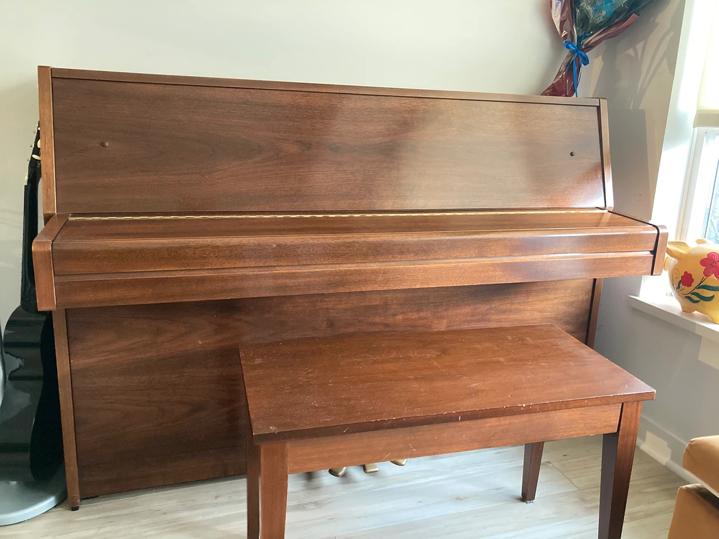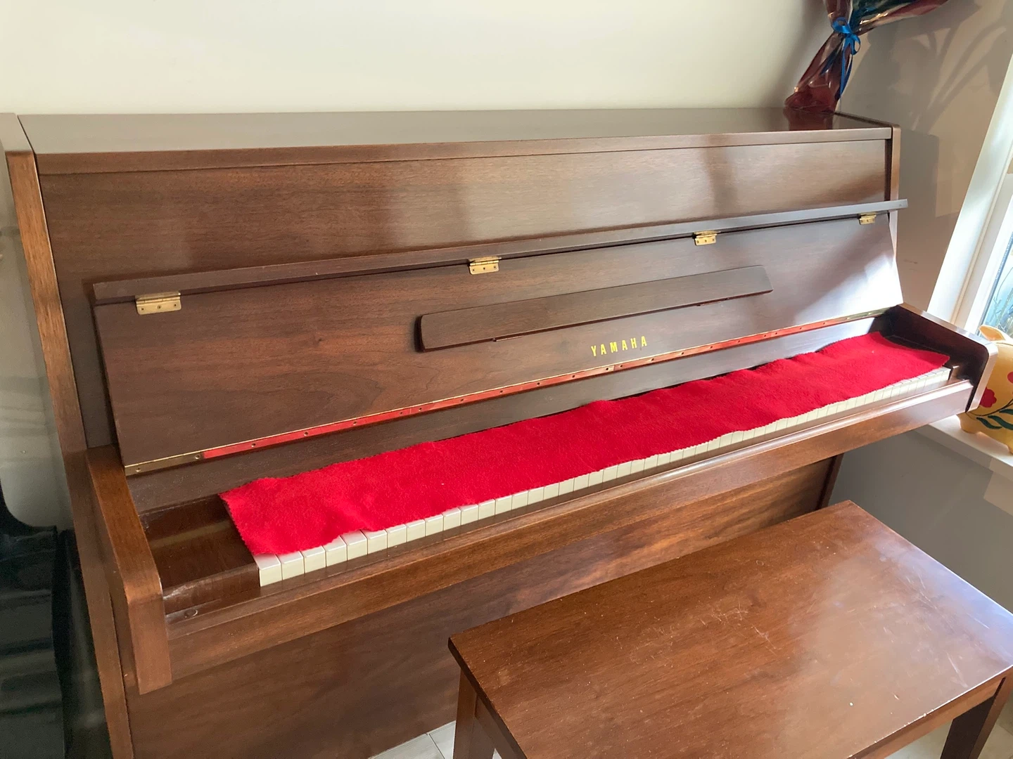 Yamaha upright piano in a classic wood finish. It comes with a matching piano bench. This instrument's keys are ivory and ebony. Perfect for any budding musician!