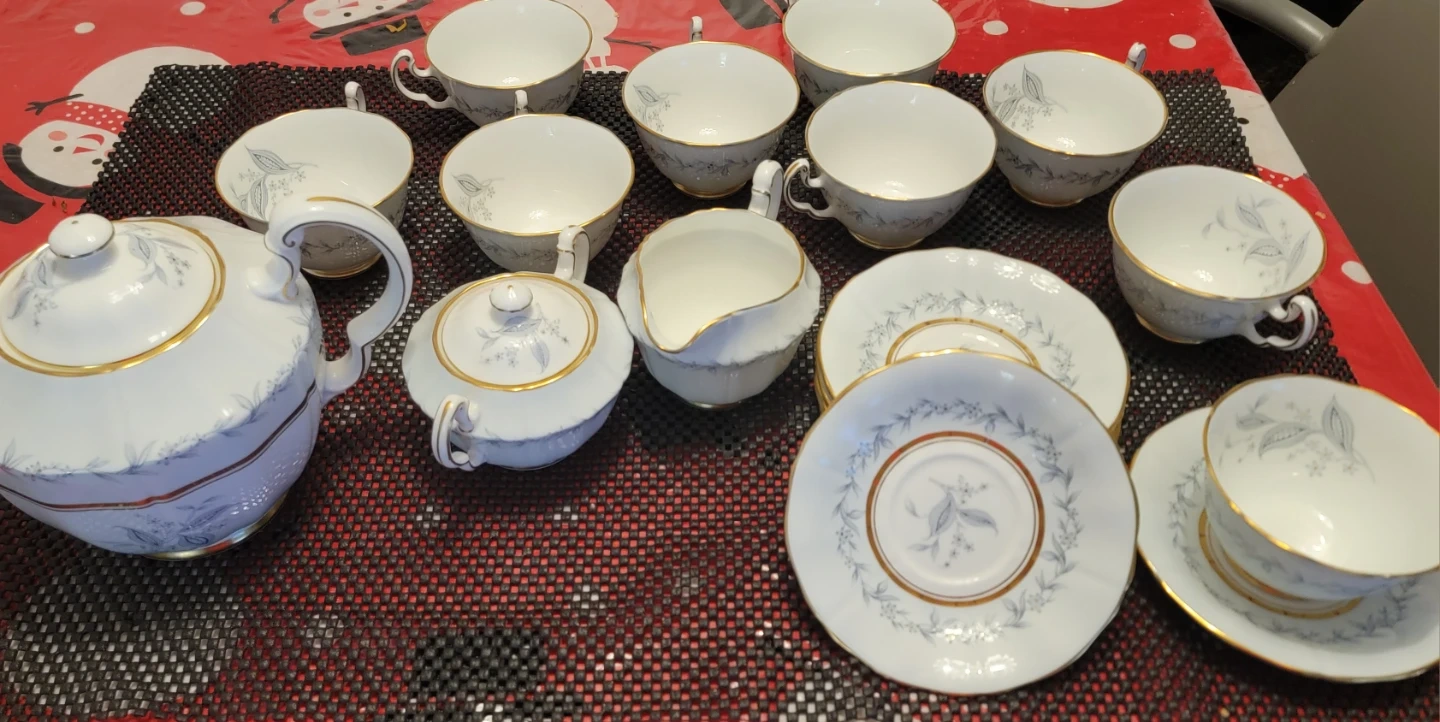 This vintage tea set includes a teapot, 9 cups with 7 saucers, a creamer pitcher, and a sugar bowl. The set features a delicate blue floral pattern with gold trim. It's perfect for serving guests or for a special occasion.
