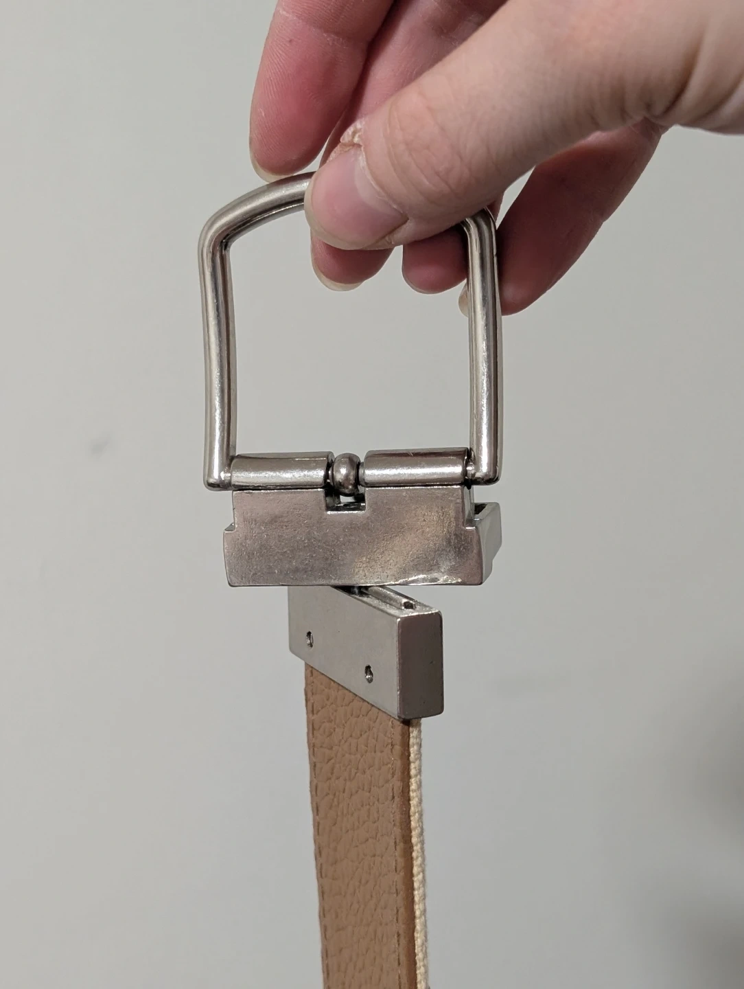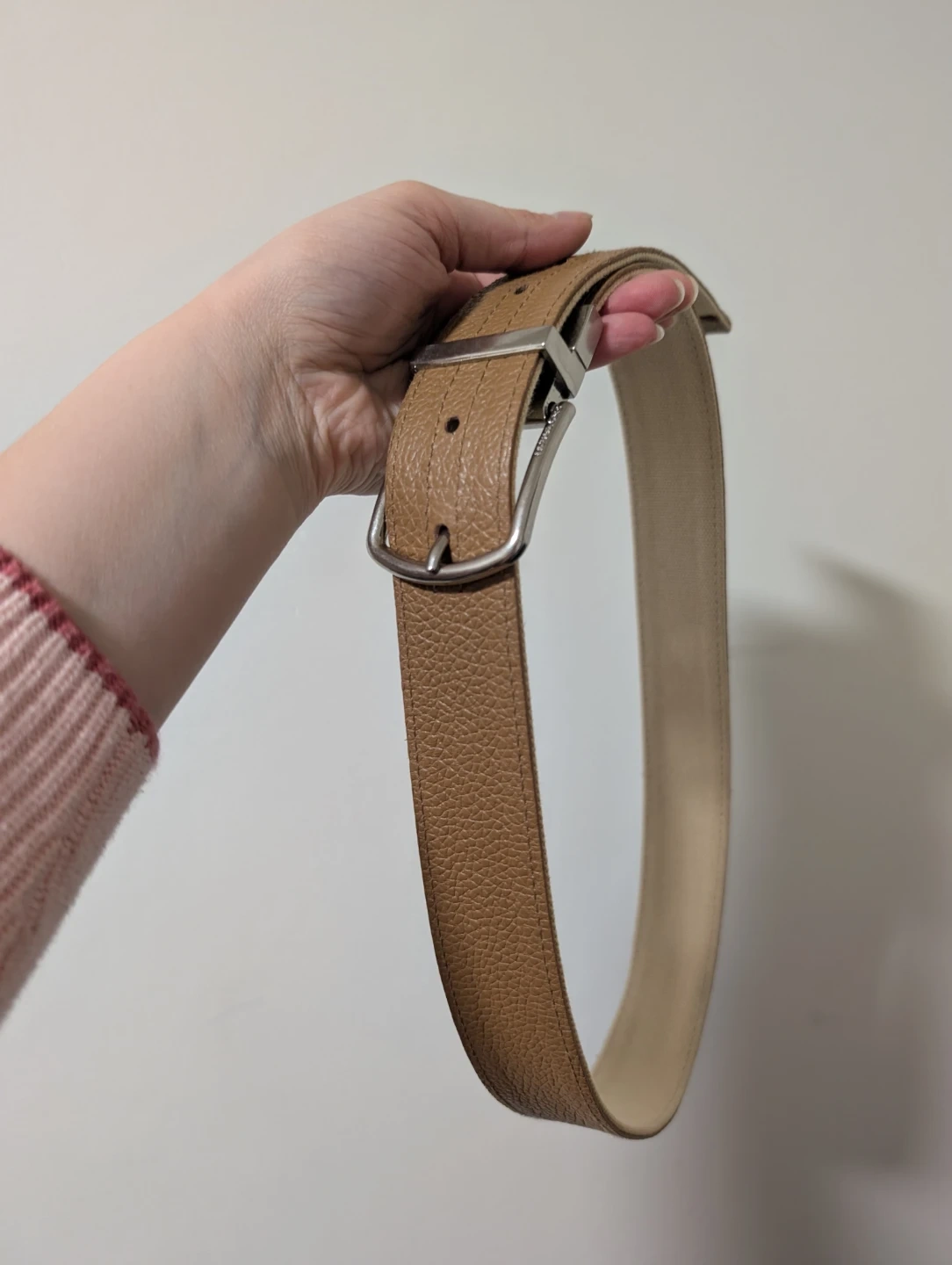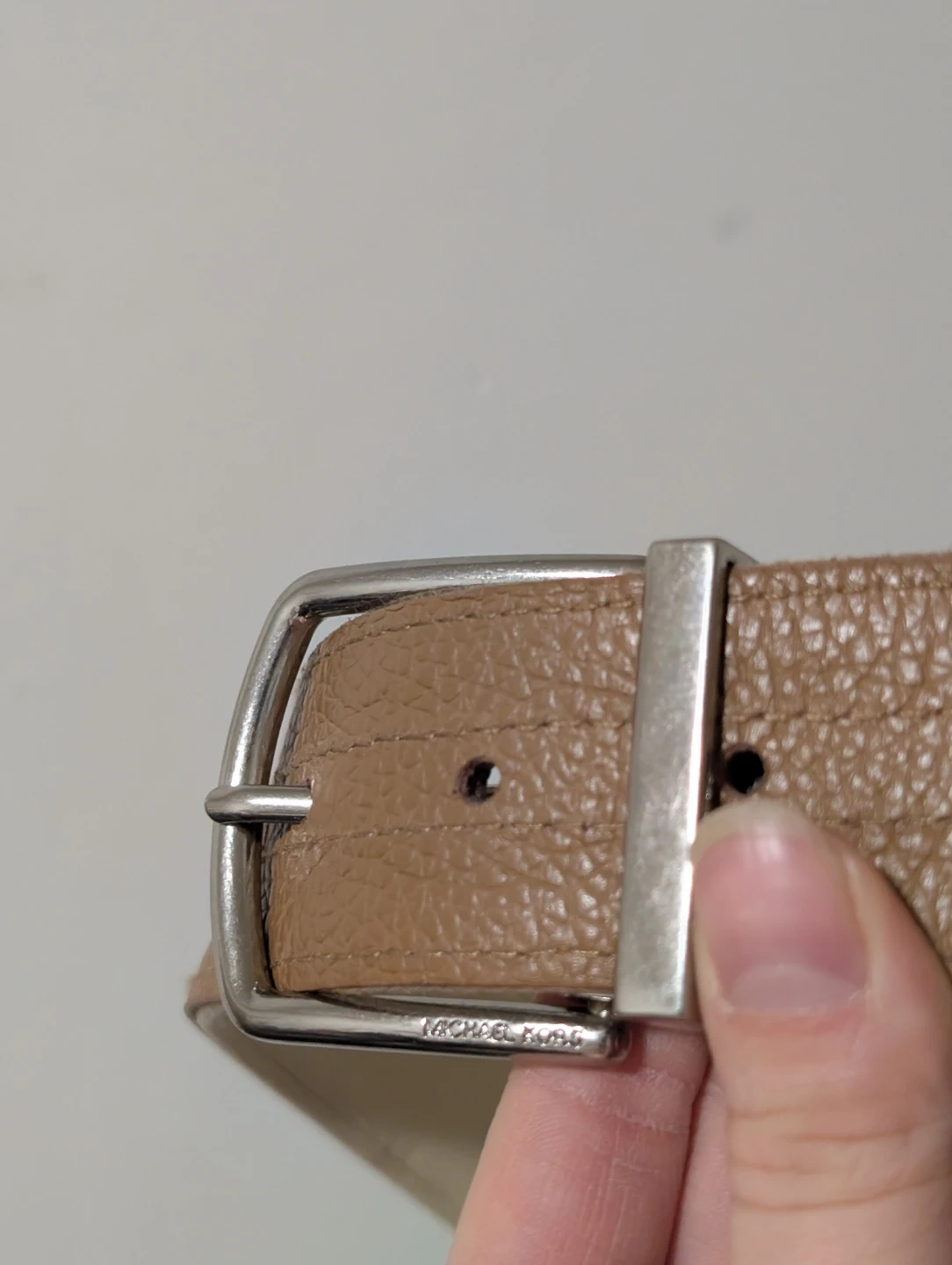 This Michael Kors belt is reversible, featuring a tan pebbled leather side and a cream canvas side with tan leather accents. It has a silver-tone buckle.