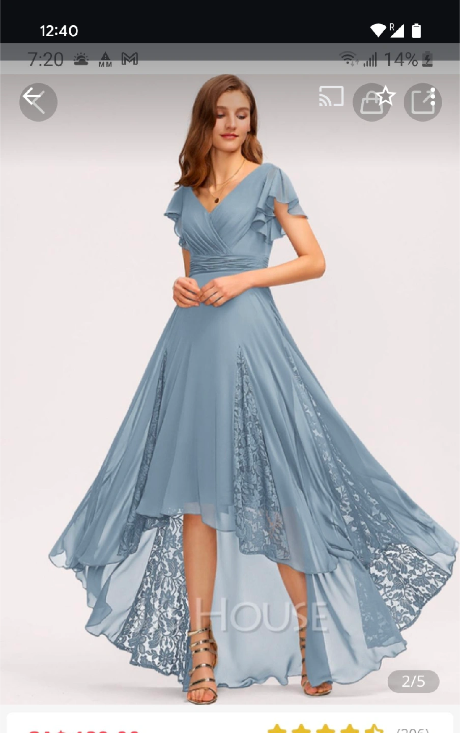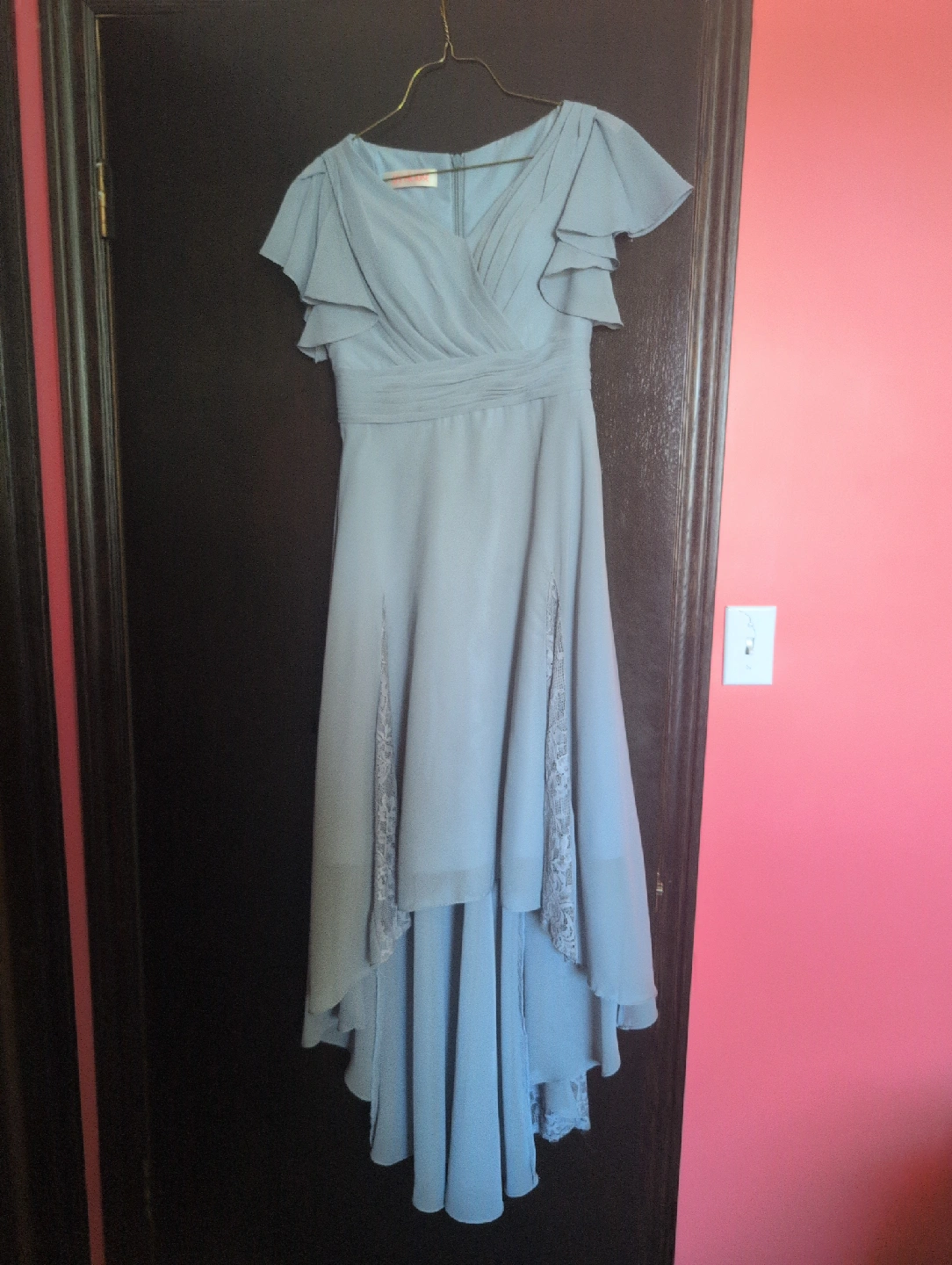 Selling a beautiful Asymmetrical bridesmaid dress in a lovely dusty blue colour! It's made of chiffon and features a high-low hem with delicate lace detailing. It's would be perfect for a wedding or special occasion! Originally bought for $189.00
