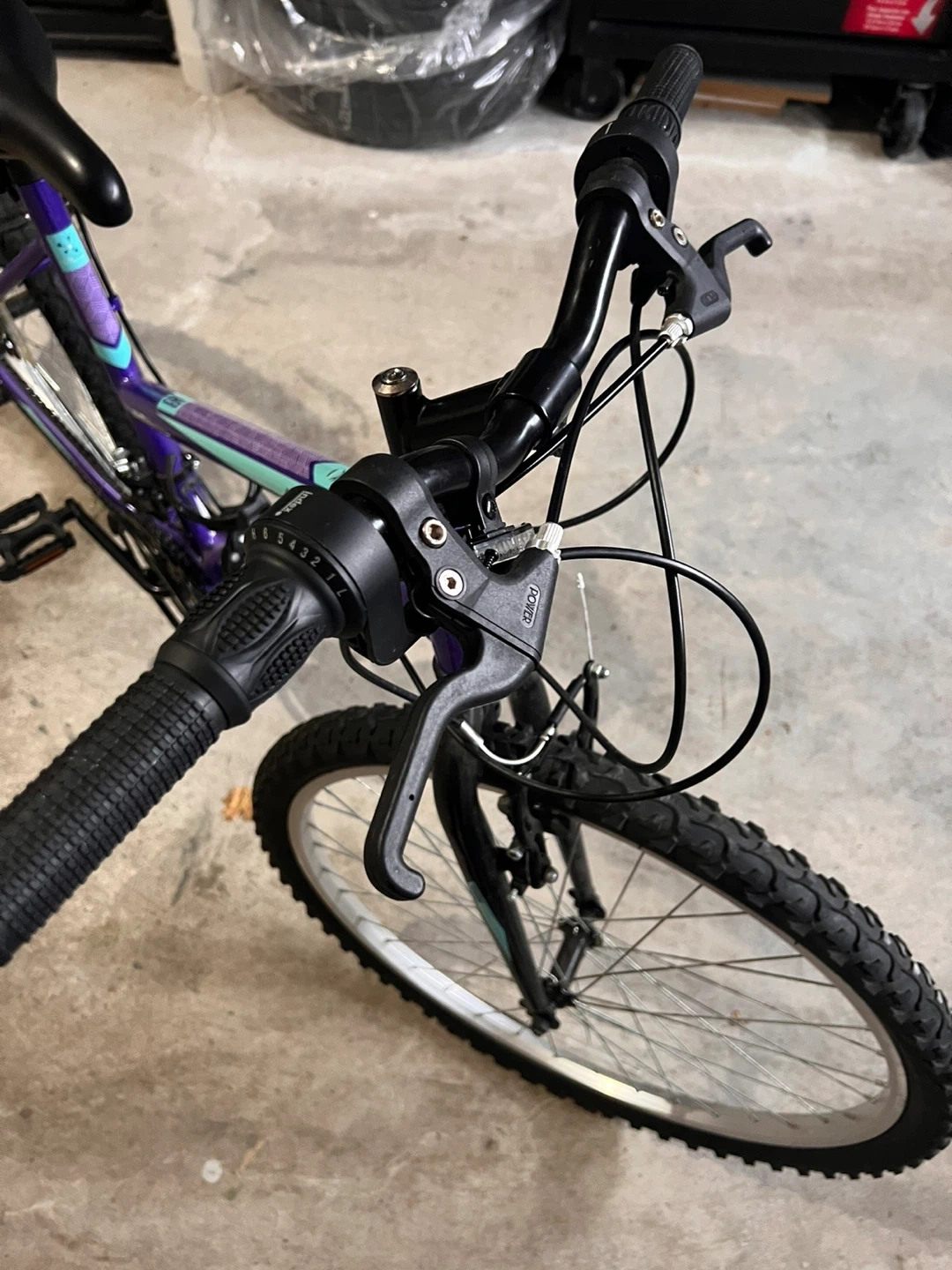 This is a purple Movelo Algonquin mountain bike. It's a Youth specific geometry model, perfect for recreational trail riding. The bike has 26 inches wheels and a durable frame.