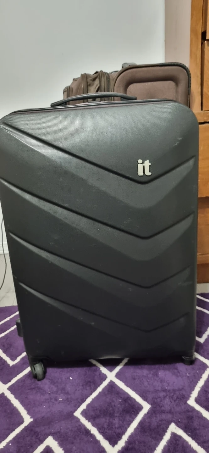 This is a black hard-shell suitcase from IT Luggage. It's a durable option for travel. The suitcase features a chevron pattern on its exterior.