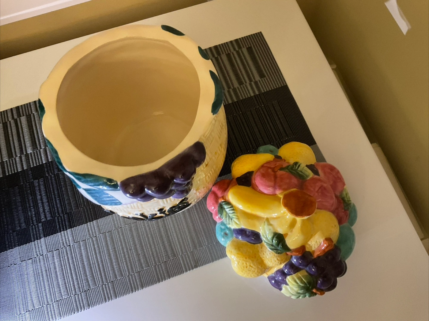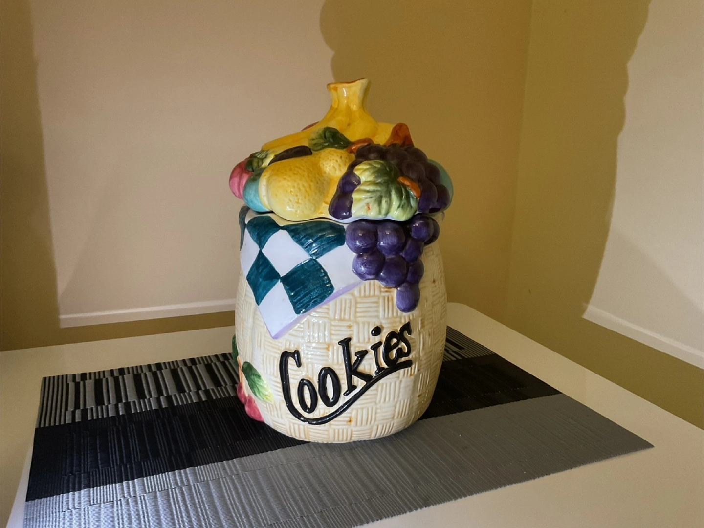 I have a ceramic cookie jar for sale! It's in good condition and has a cute design with fruit on the lid and the word "Cookies" on the front