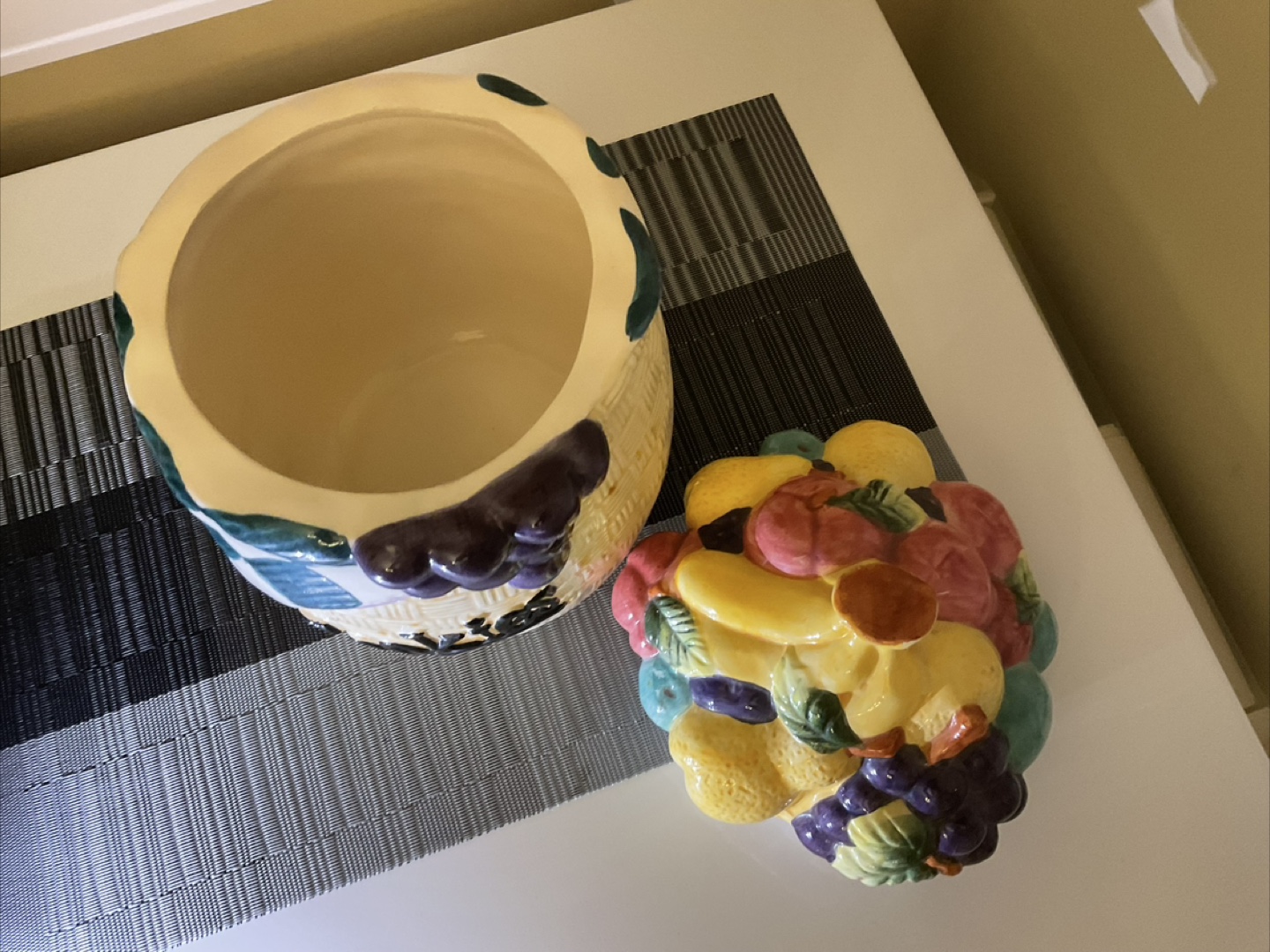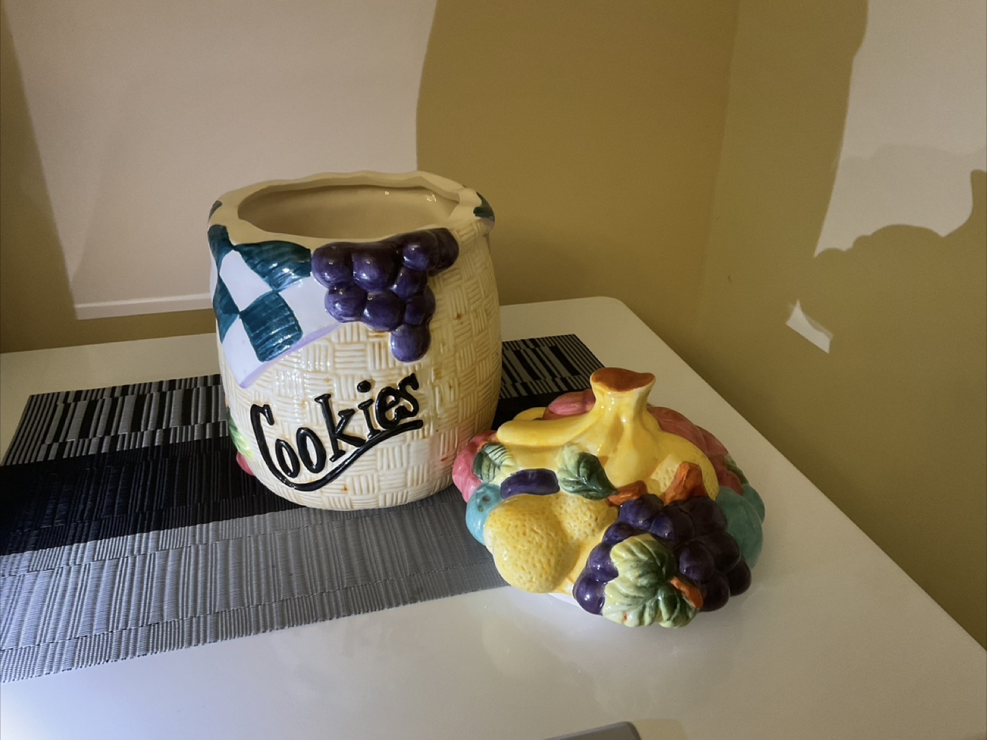 I have a ceramic cookie jar for sale! It's in good condition and has a cute design with fruit on the lid and the word "Cookies" on the front