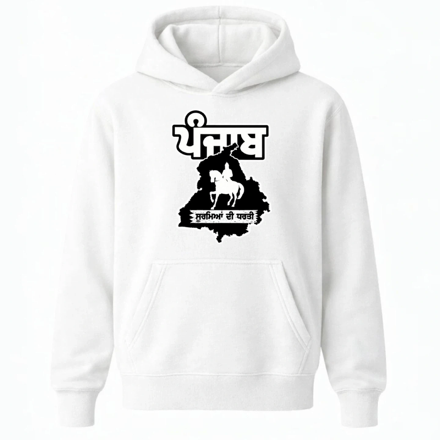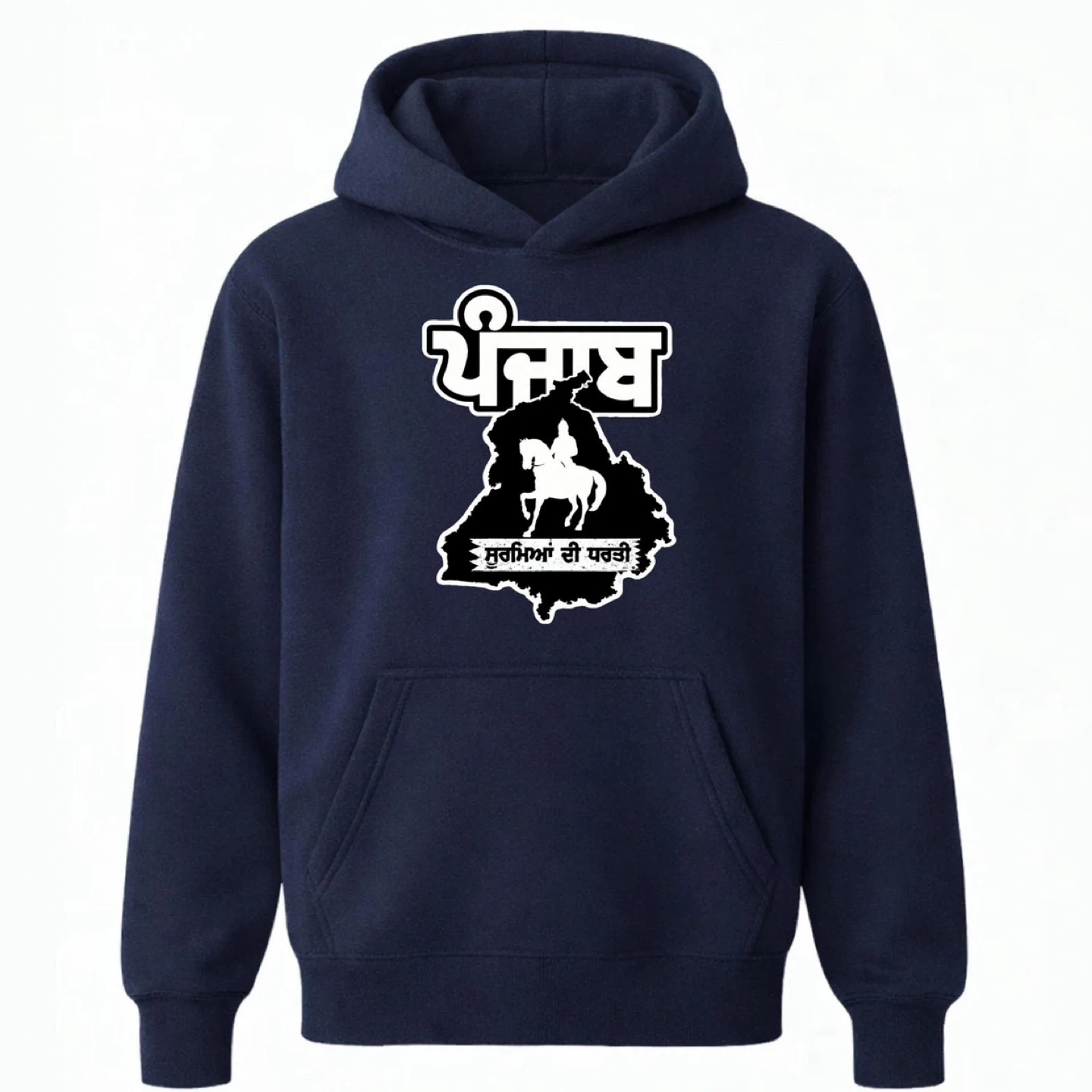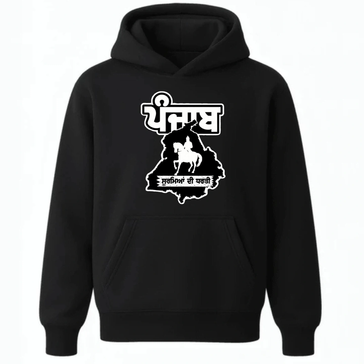 This hoodie features a bold graphic of the Punjab map with a Sikh warrior on horseback. It's made from a comfortable fabric blend, perfect for everyday wear. Show your pride with this unique piece!
