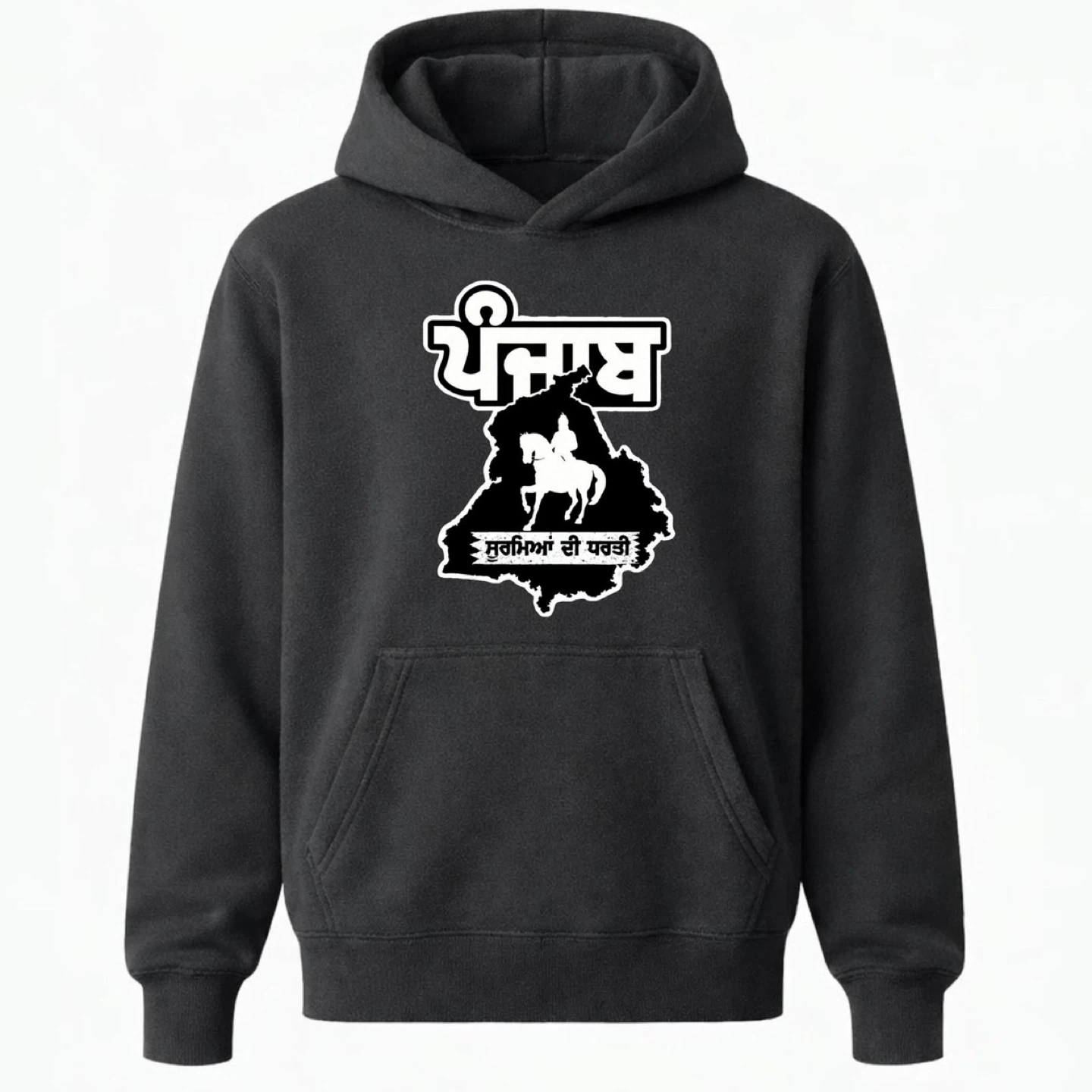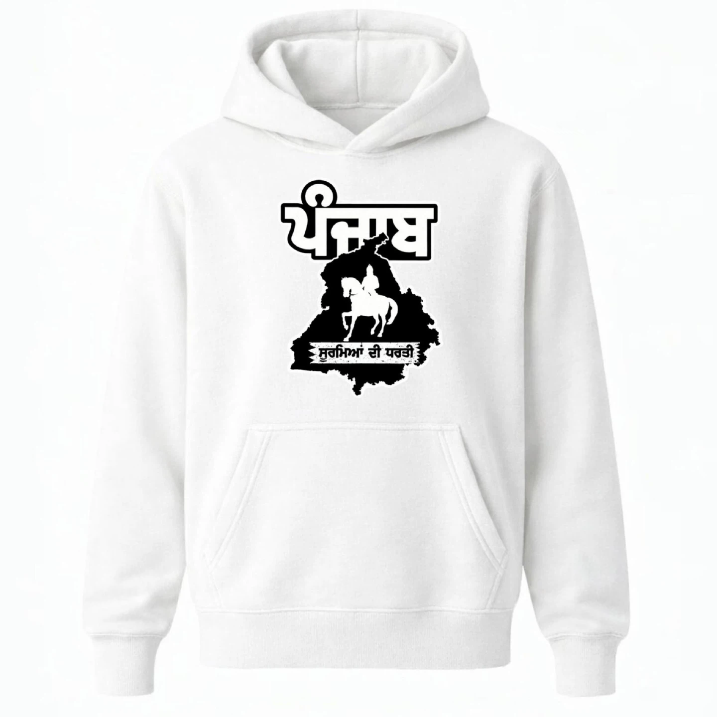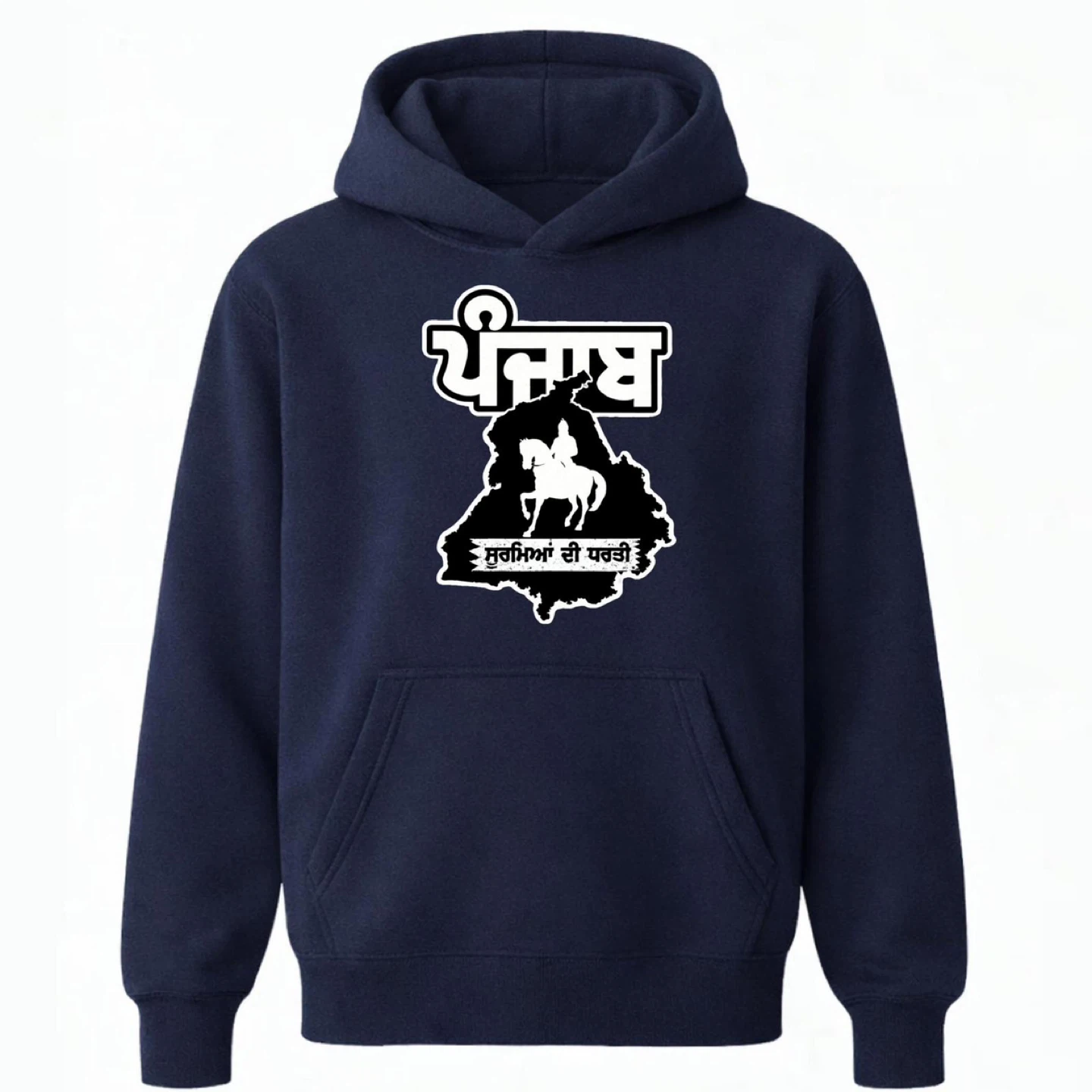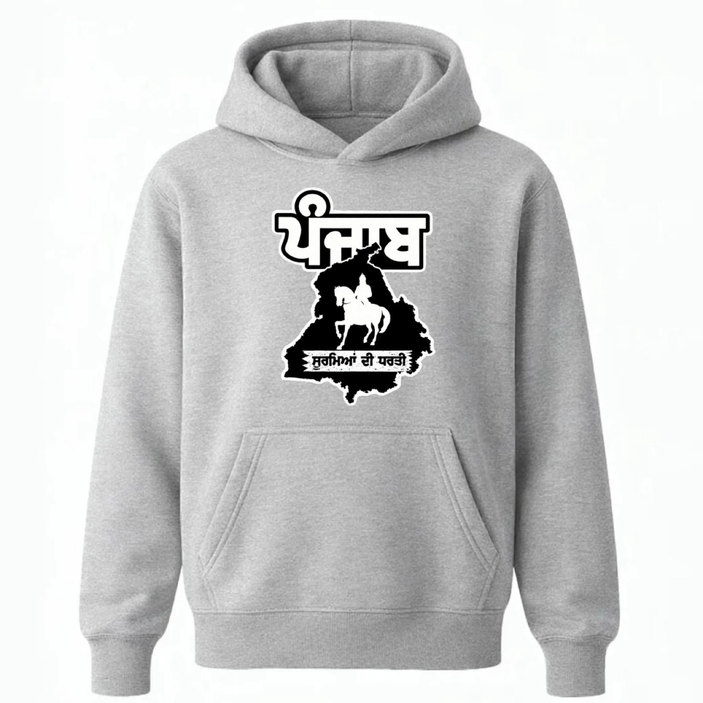 This hoodie features a bold graphic of the Punjab map with a Sikh warrior on horseback. It's made from a comfortable fabric blend, perfect for everyday wear. Show your pride with this unique piece!
