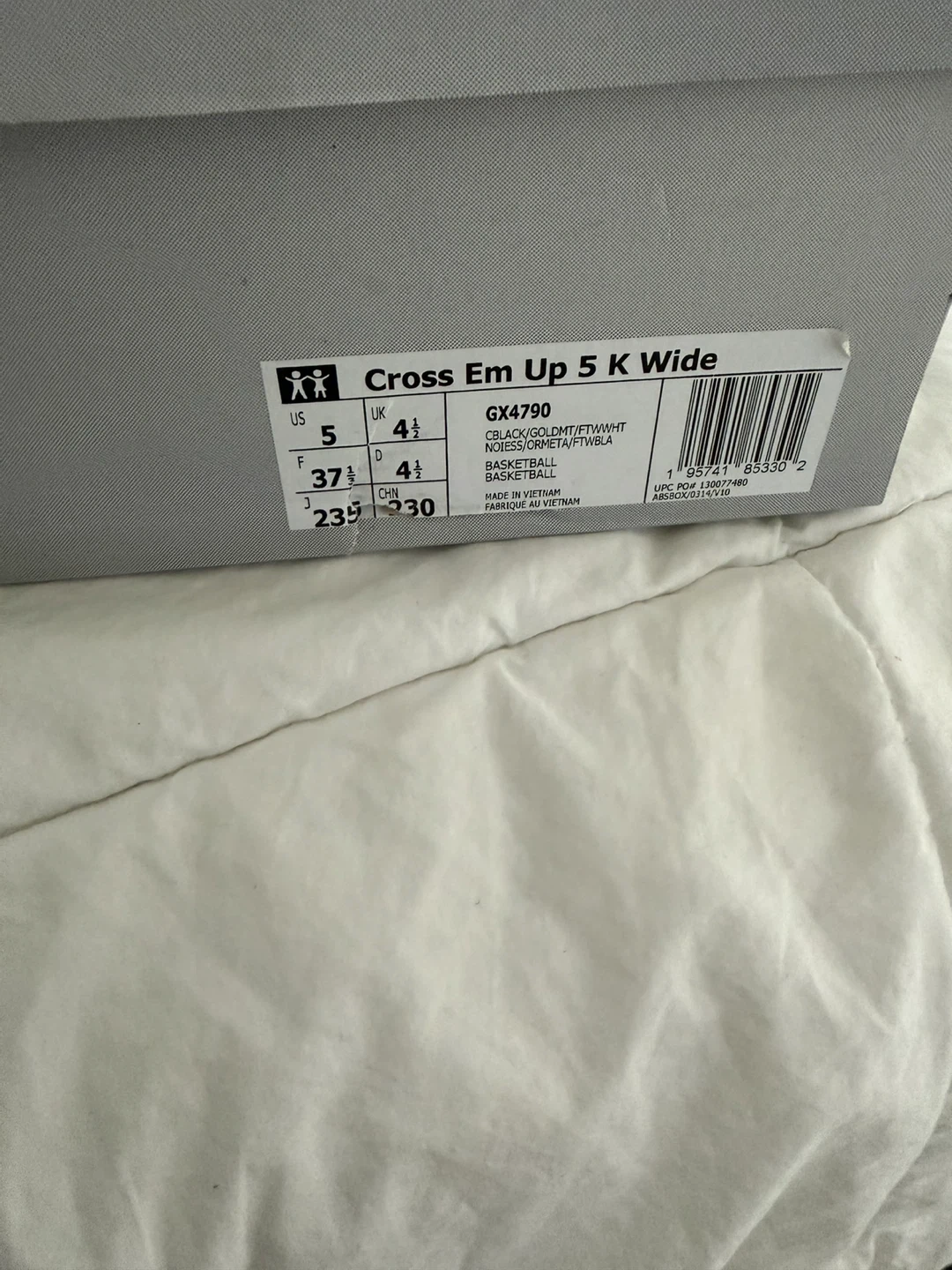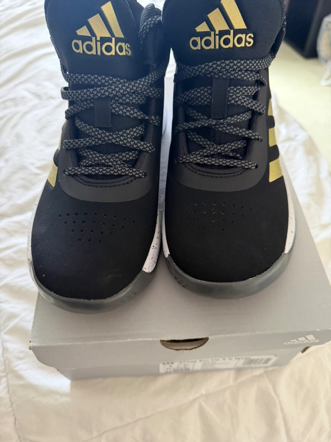 These Adidas basketball shoes are black with gold accents. They're a size 5 Wide (US). Includes original box.
