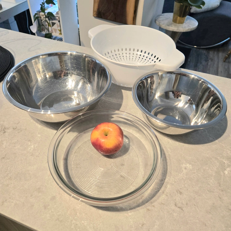 Mixing Bowl Set - Stainless Steel, Colander, Glass Pie Dish