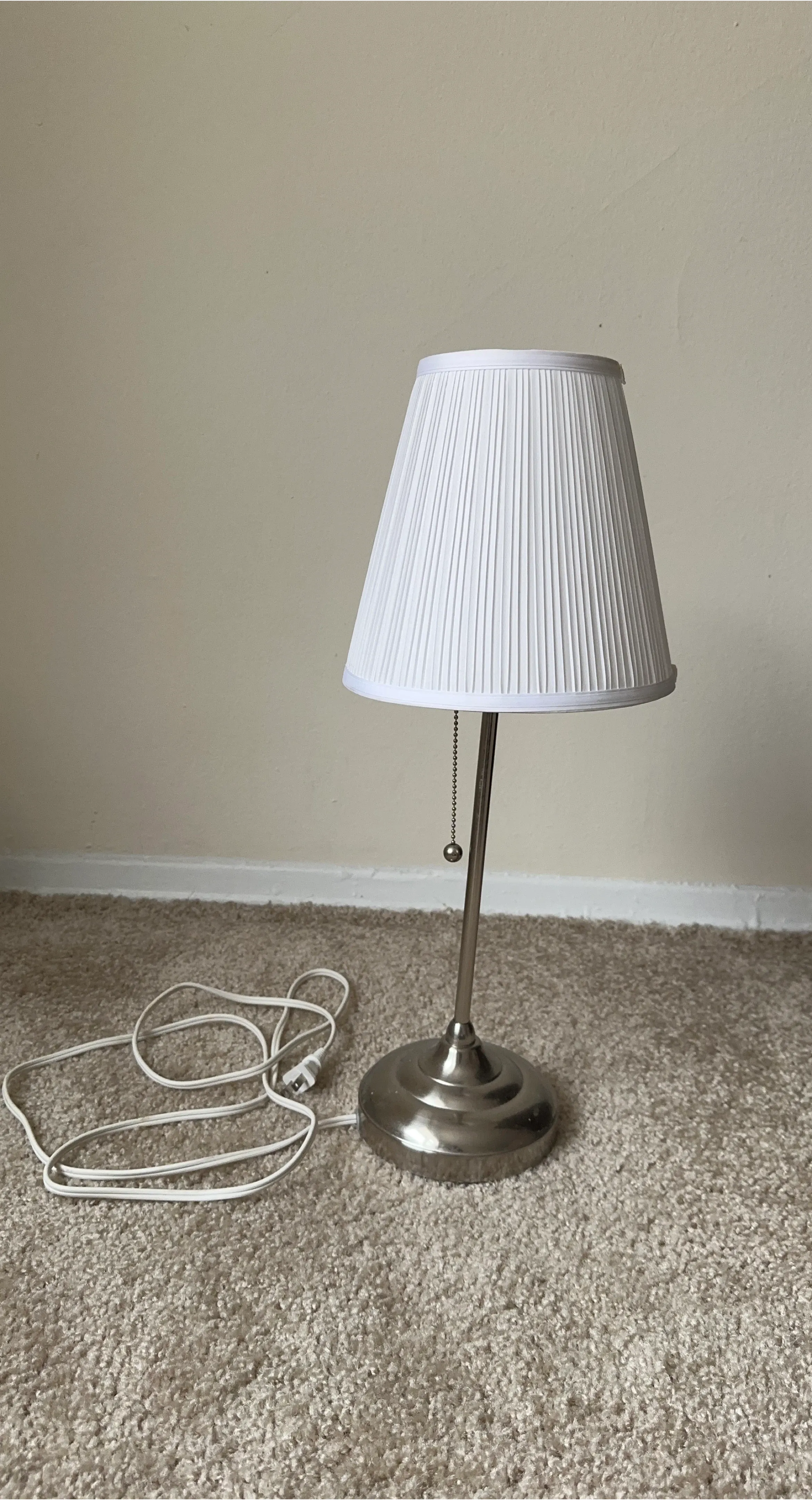 This table lamp features a white pleated shade and a brushed nickel finish. It has a pull chain for easy on and off. It's a classic design that works in many rooms.