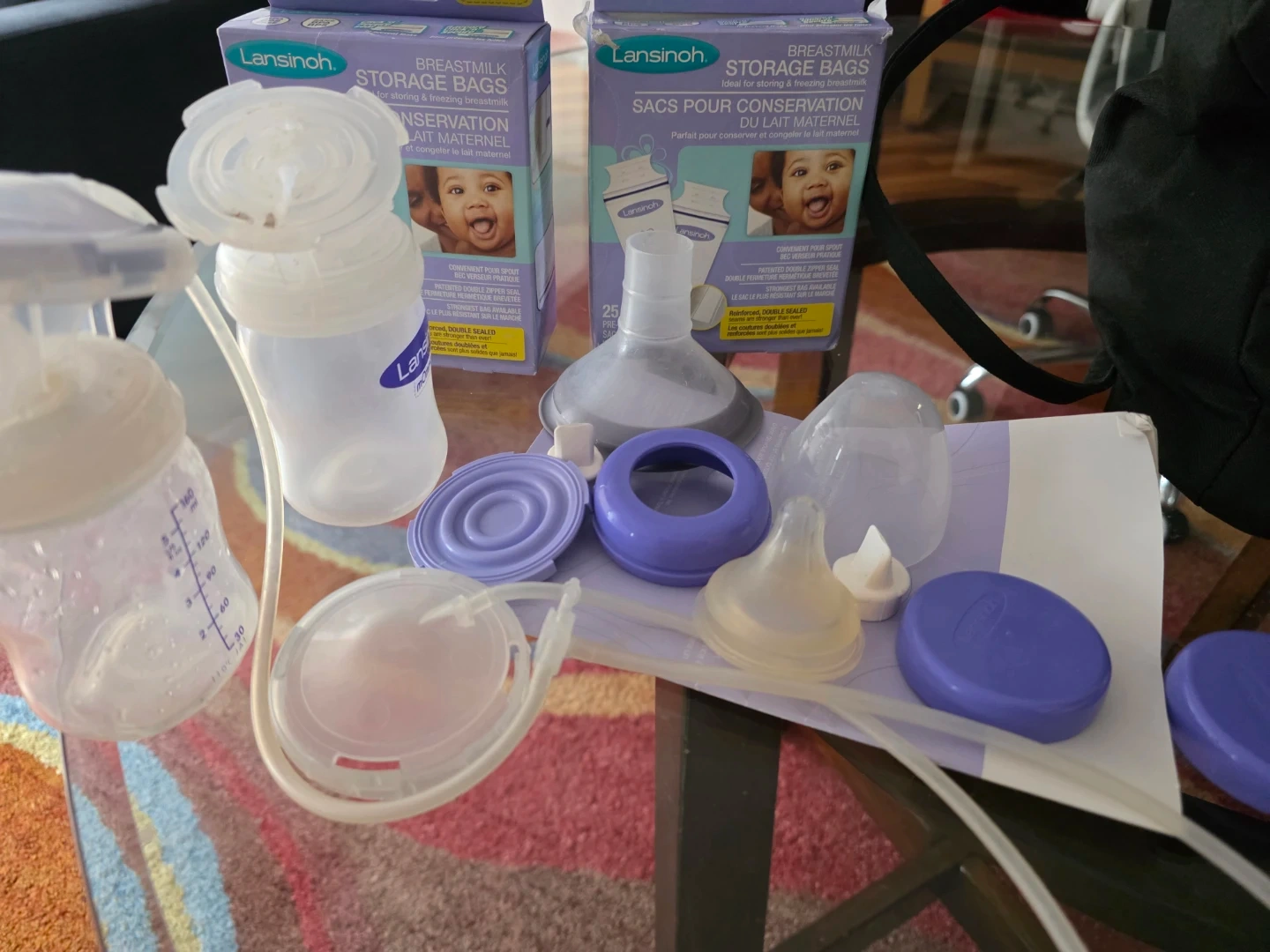 This Lansinoh double electric breast pump comes with all its accessories and two boxes of breast milk storage bags. It's designed for efficient milk expression. The pump is portable and includes a travel bag.