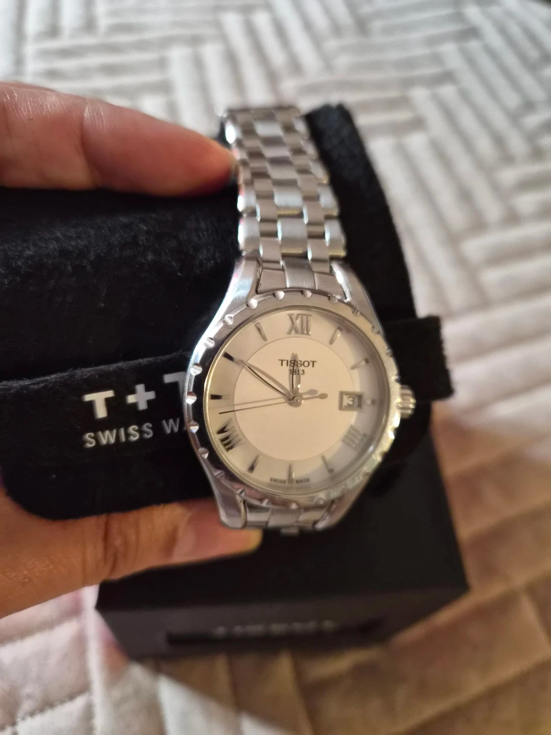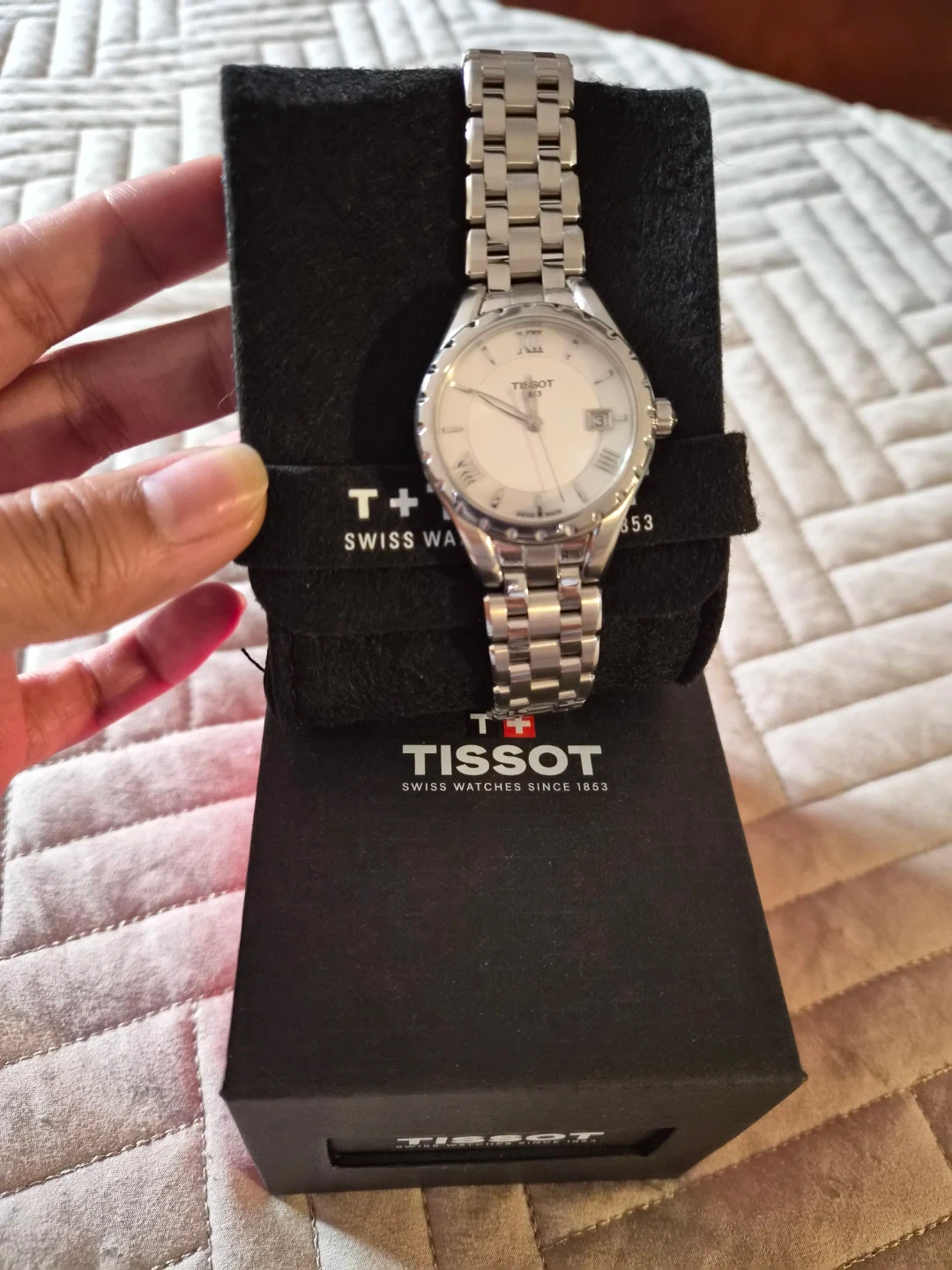 A Tissot watch with a silver-tone stainless steel band and a white mother of pearl dial. It features Roman numerals and a date display. Date just. Swiss Made. Comes with box and pouch. Bracelet is new from Tissot. Comes with extra link