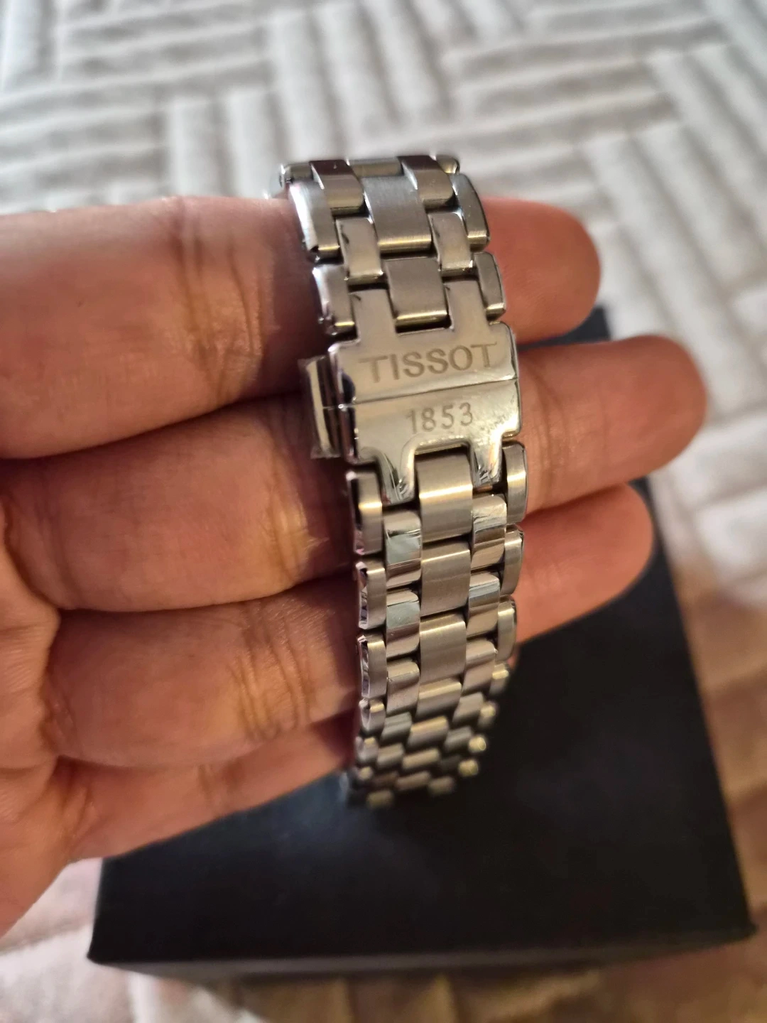 A Tissot watch with a silver-tone stainless steel band and a white mother of pearl dial. It features Roman numerals and a date display. Date just. Swiss Made. Comes with box and pouch. Bracelet is new from Tissot. Comes with extra link