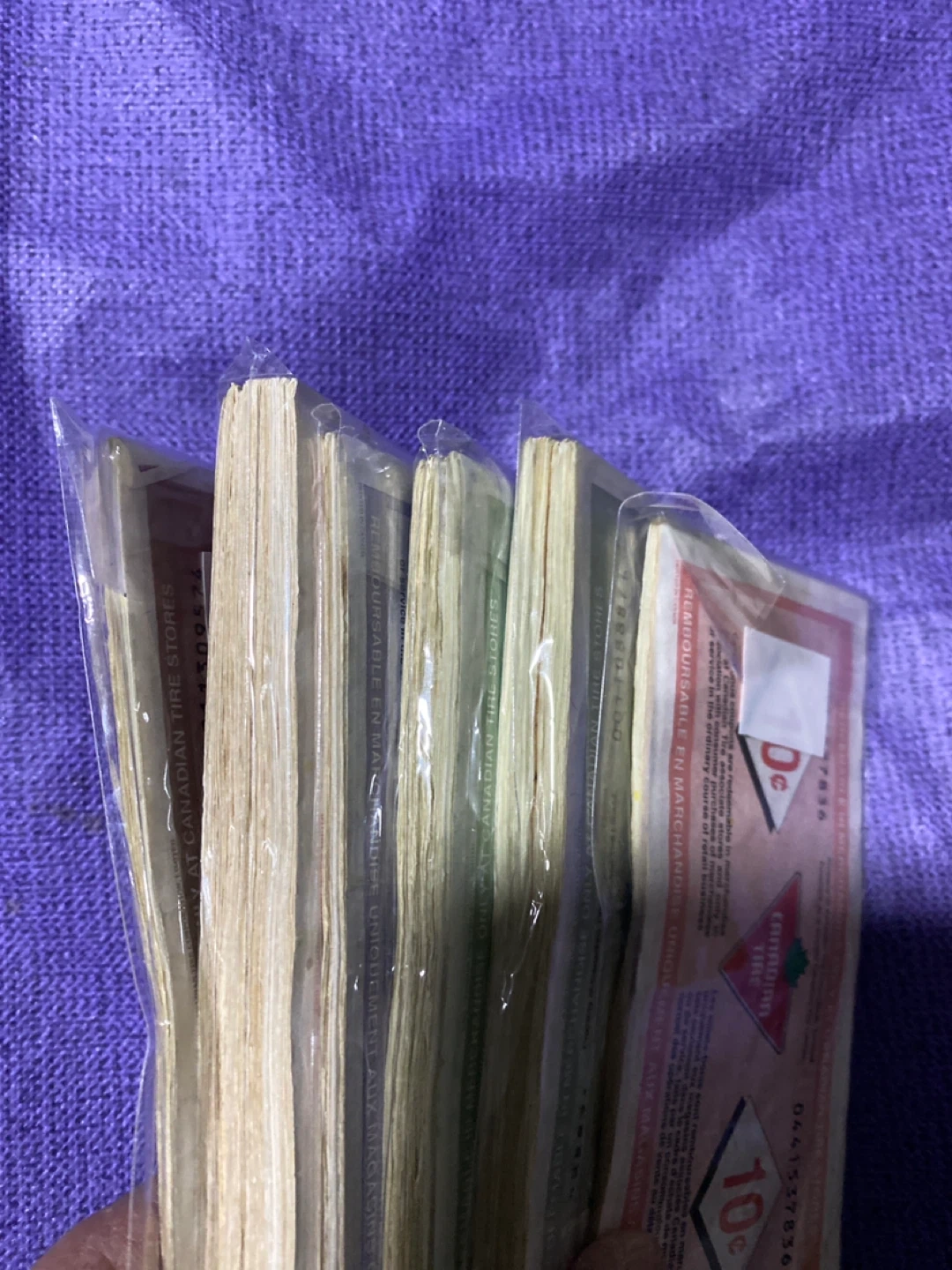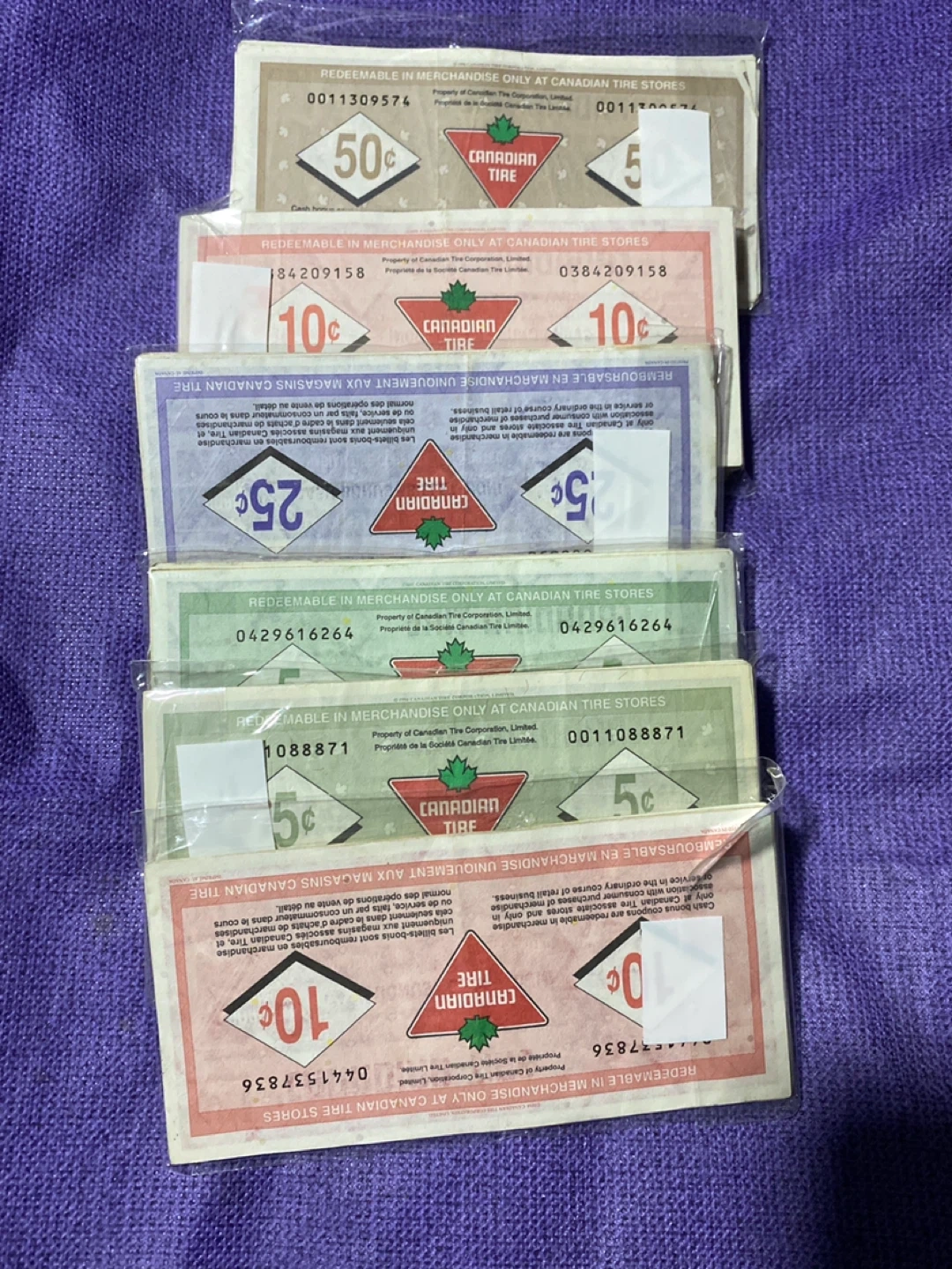 Collection of Canadian Tire cash bonus bills. Includes 50¢, 25¢, 10¢, and 5¢ denominations. Redeemable in merchandise only at Canadian Tire stores. 254 pieces
