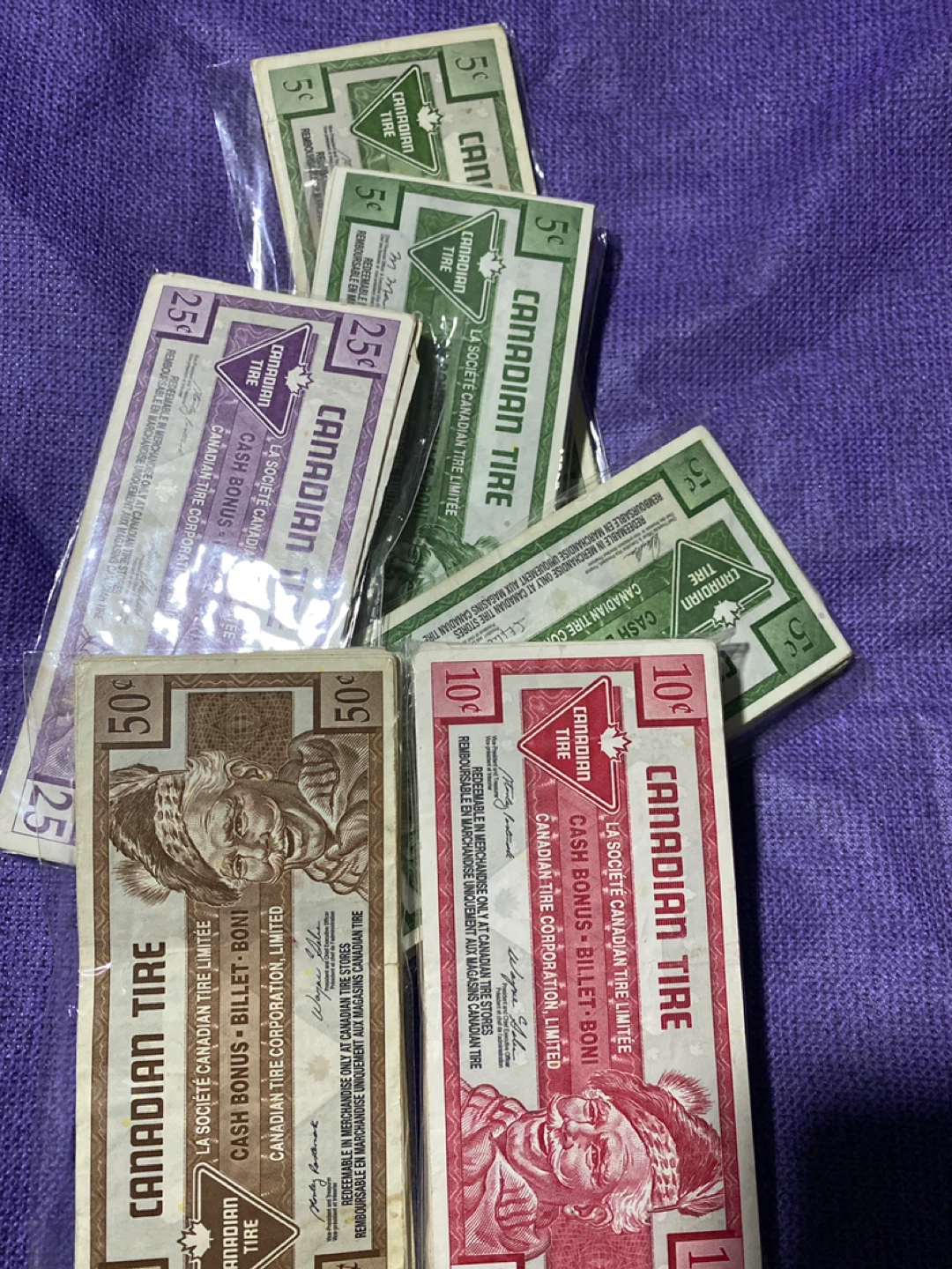 Collection of Canadian Tire cash bonus bills. Includes 50¢, 25¢, 10¢, and 5¢ denominations. Redeemable in merchandise only at Canadian Tire stores. 254 pieces