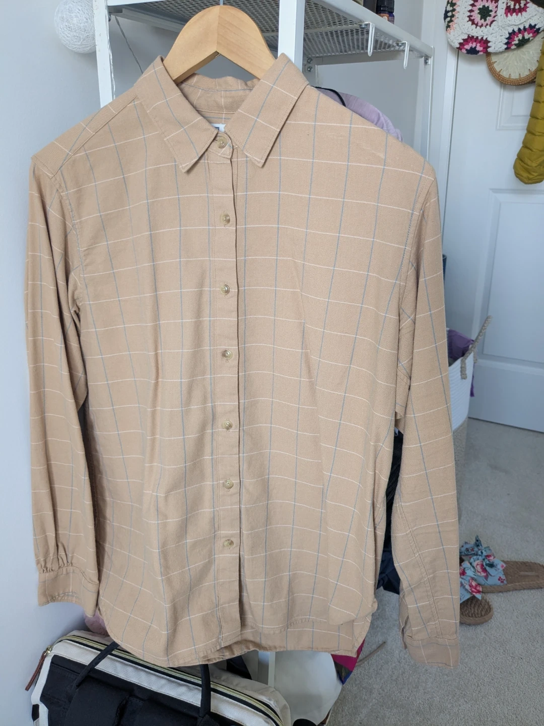 Uniqlo shirt. It's a size small and features a classic plaid pattern in neutral tones. Perfect for layering or wearing on its own!