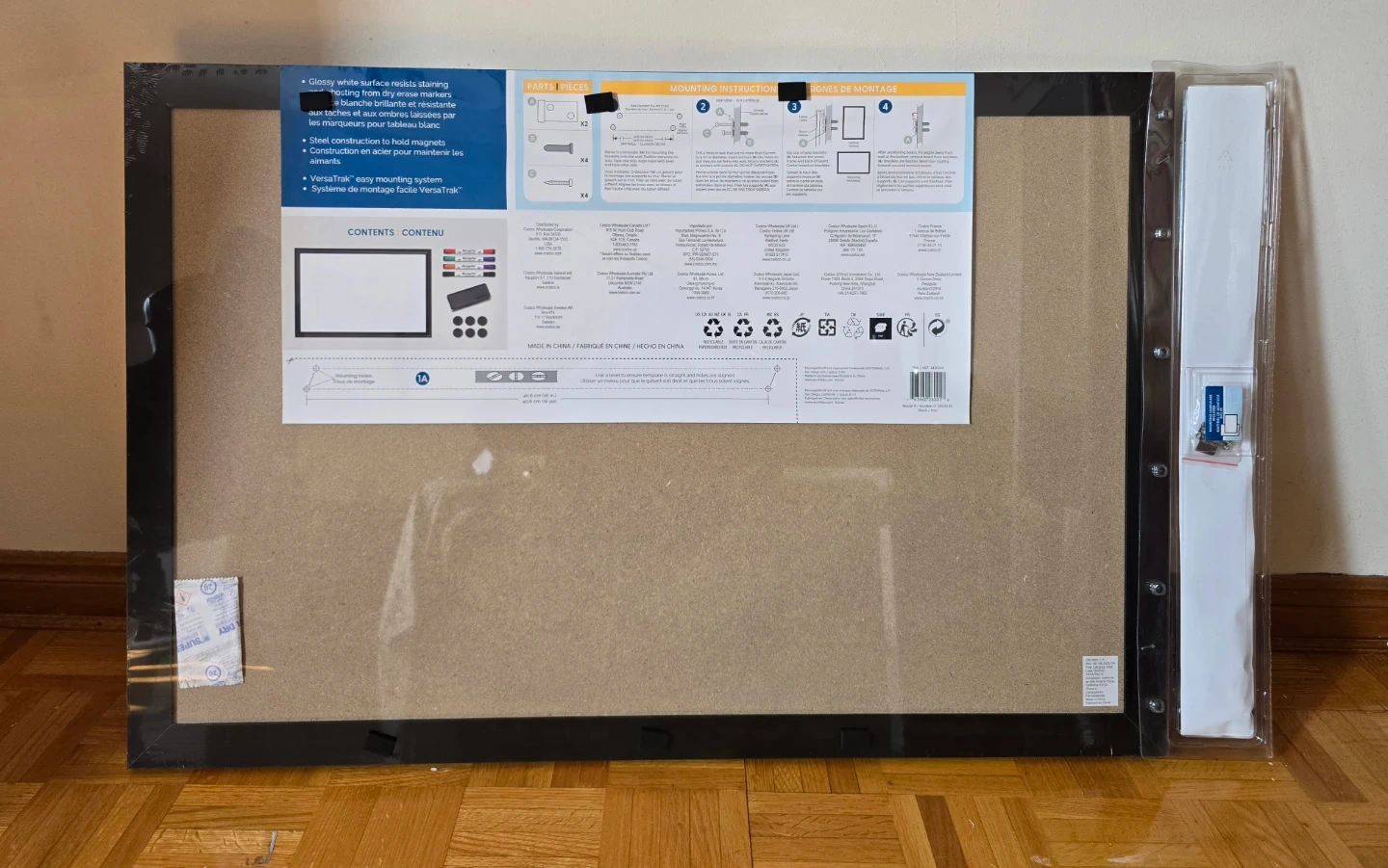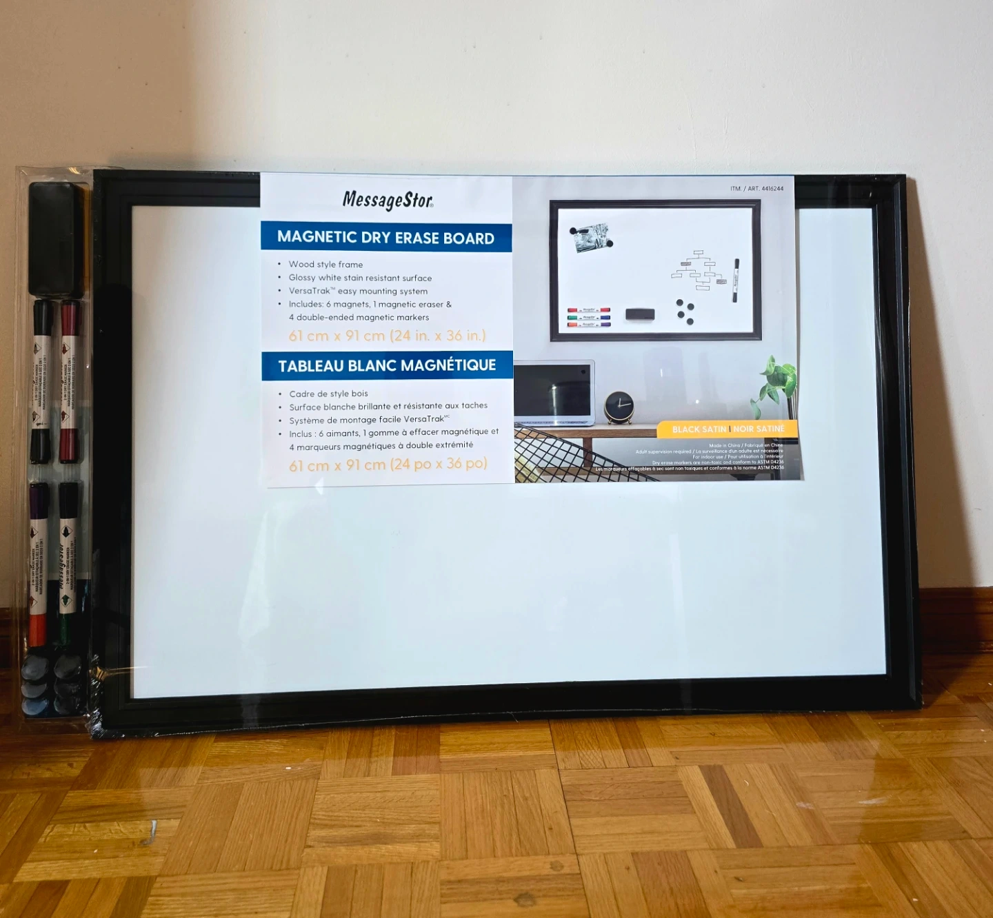 It measures 61 cm by 91 cm(24inch×36 inch). Includes 4 magnetic markers, an eraser, and mounting hardware.