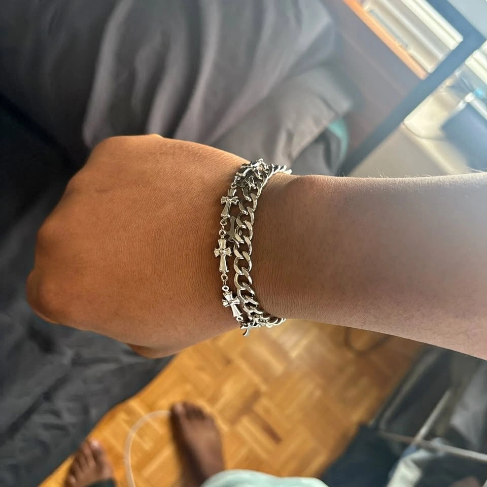 Durable retro-style Cuban link bracelet with cross detail. Made from 304 stainless steel, it won’t fade or tarnish. This unisex bracelet has an adjustable fit, perfect for layering or wearing solo. Great for streetwear, alt fashion, or gifting. Never worn.