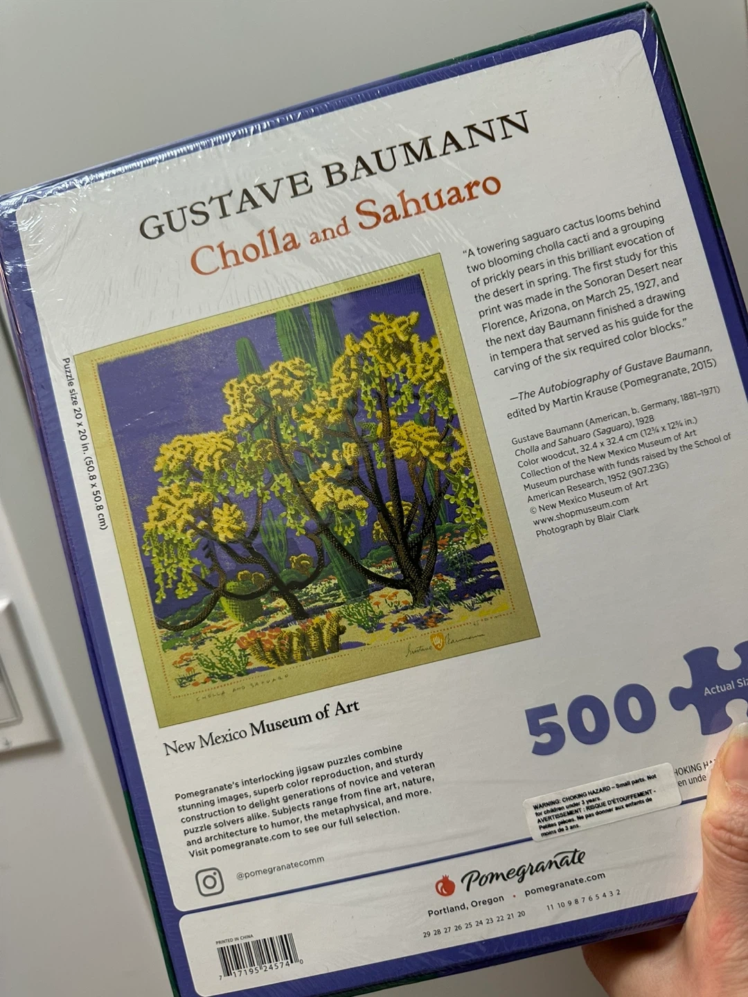 Pomegranate Artpiece Puzzle featuring Gustave Baumann's Cholla and Sahuaro painting. This is a 500-piece jigsaw puzzle. The completed puzzle size is 20.25in. x 26.5in. (50.8 cm x 67.3 cm). It's perfect for puzzle enthusiasts and art lovers alike!