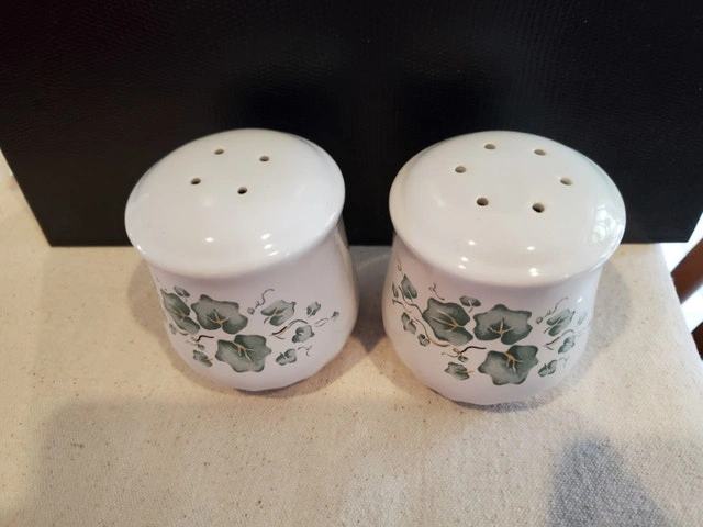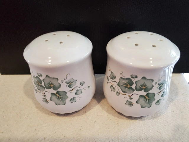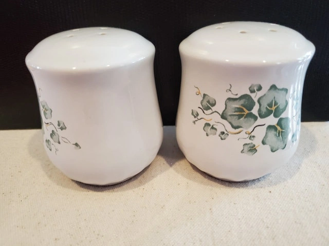 A pair of salt & pepper shakers in the Callaway Ivy pattern. These are Corelle Coordinates, matching the Corning Ware line. The shakers are stoneware, with the plugs at the bottom and stand just under 3" tall. They're in great shape - $15.00, pick up only