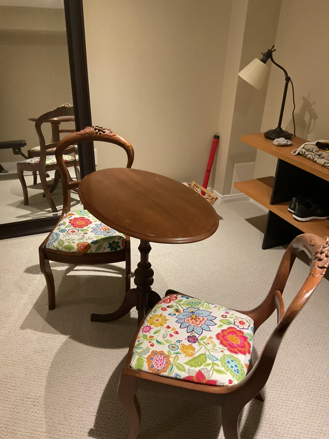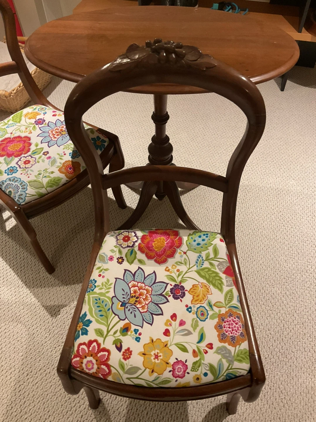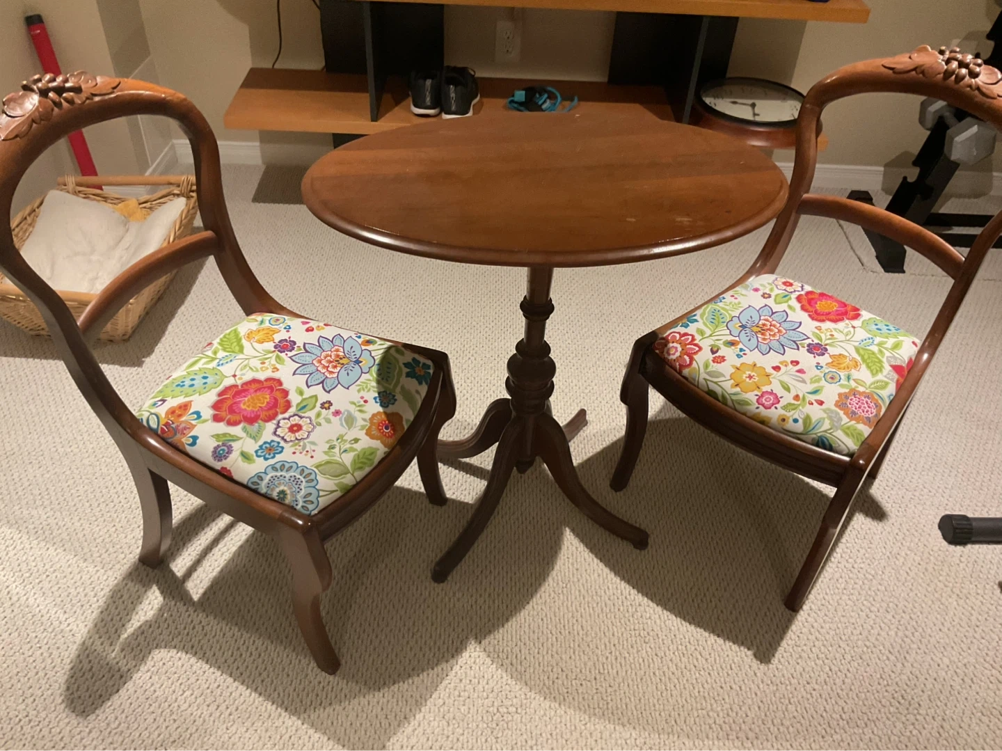 Charming wood bistro table and two chairs with colourful floral upholstered seats. This set's compact size makes it suitable for smaller spaces. Wood construction with carved detailing on the chairs. Table top width is 29 inches.