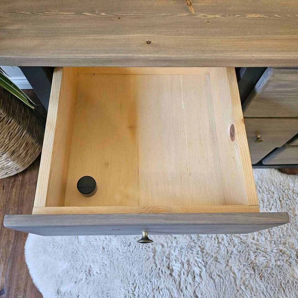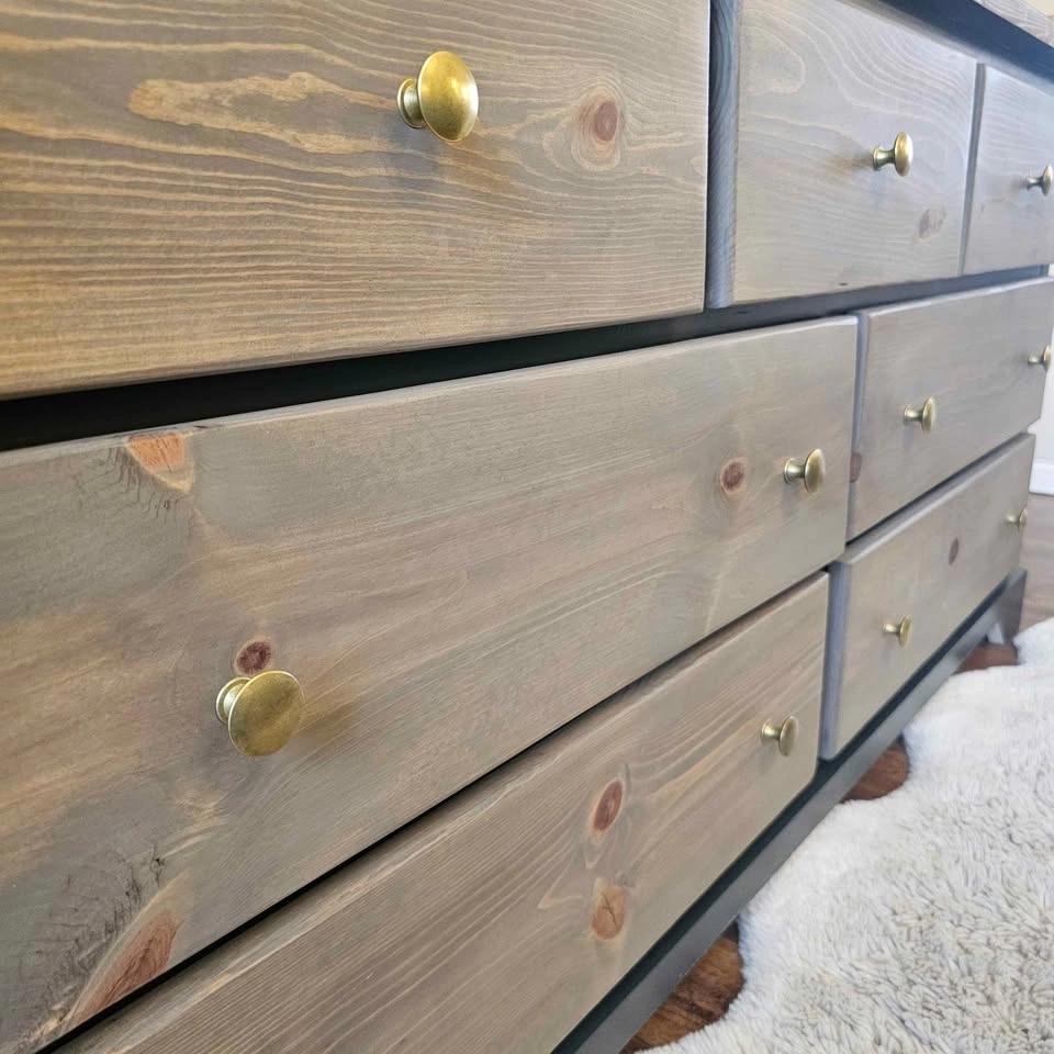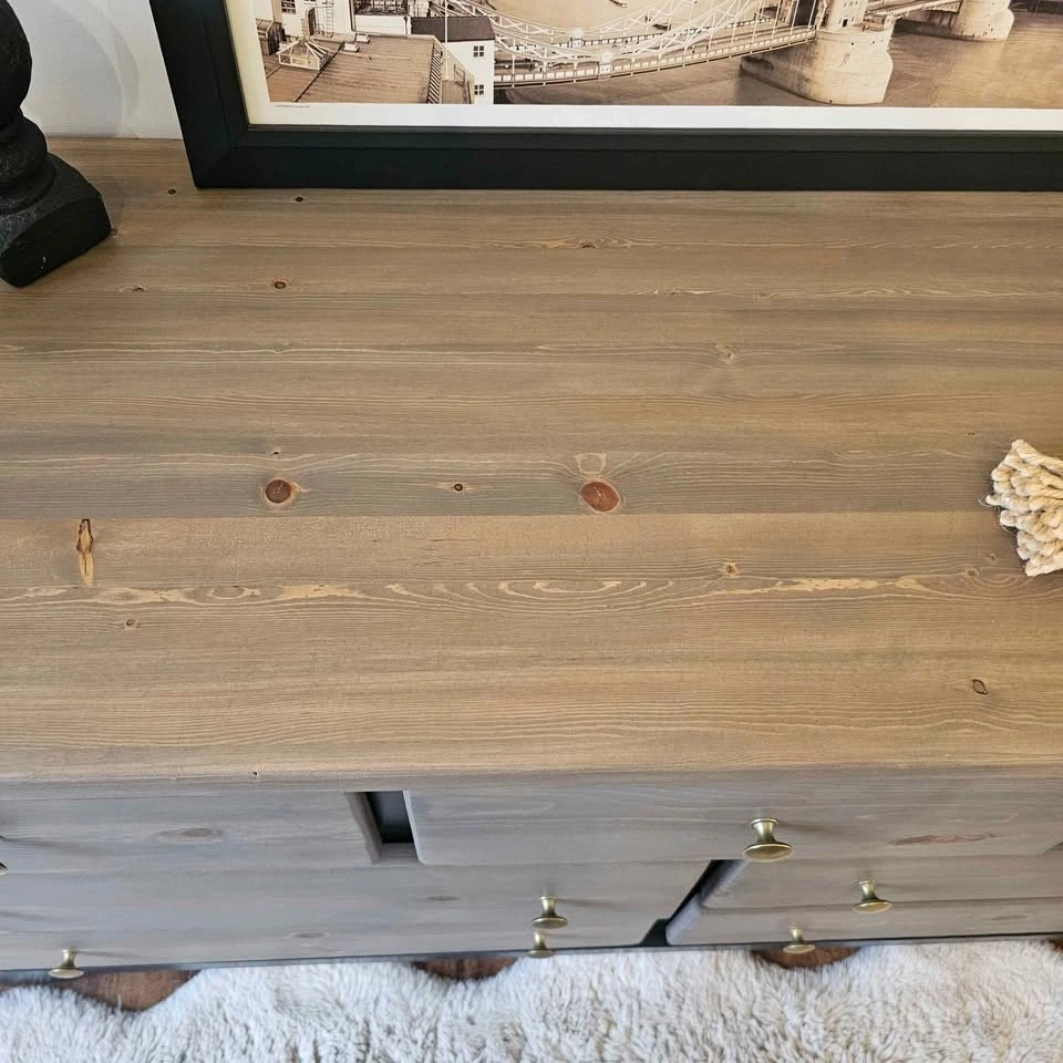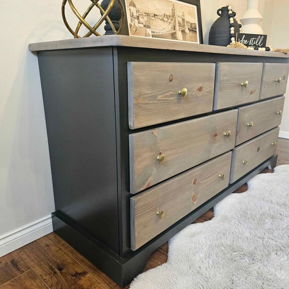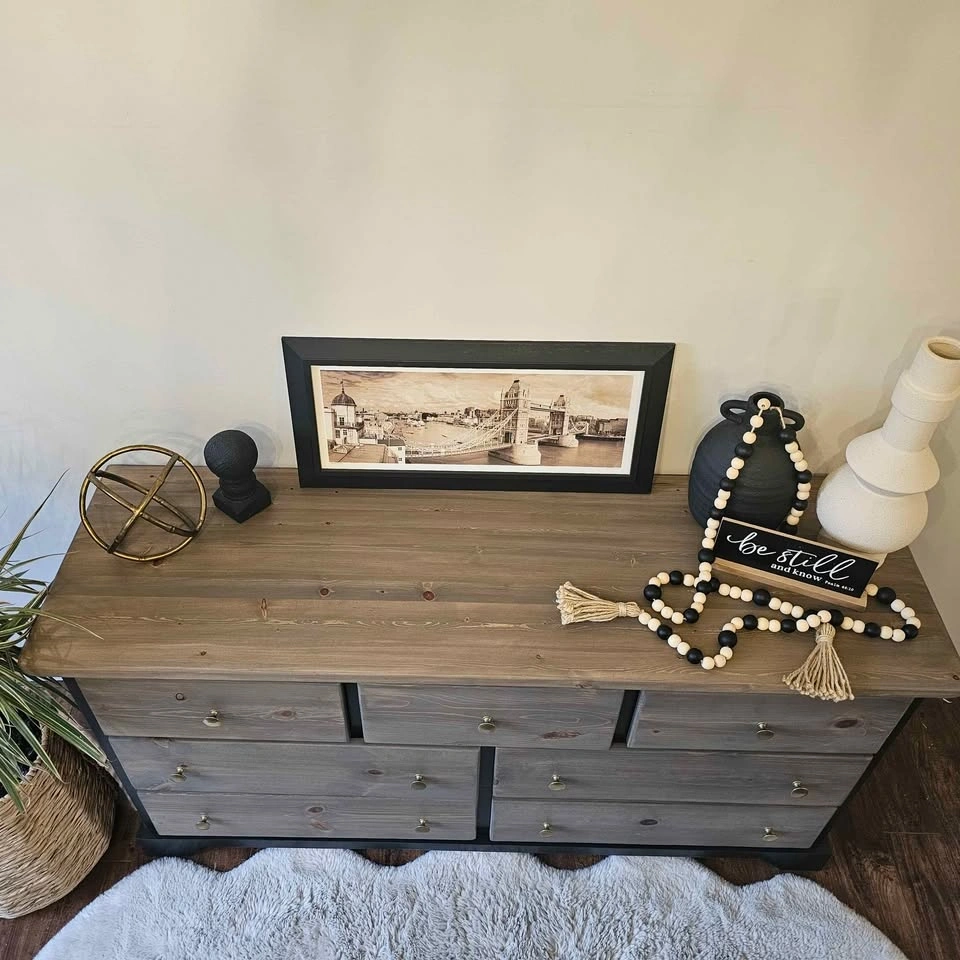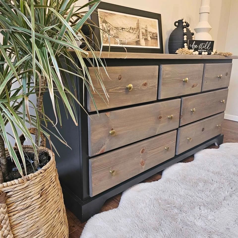 Refinished solid pine wood dresser. Painted in Benjamin Moore's cabinetry paint in the colour Black Beauty with a sprayer for a very smooth finish. The rest has been sanded down and stained with the colour Whole Wheat, a popular brown/grey toned stain, and topped with Diamond Finish Varathane in a Matte finish for durability. The drawers are all on rollers and open and close very smoothly. They feature super thick and solid walls and bottoms that will last a long time. Brand new brass knobs have been added. Dimensions: 58 inches wide, 18 inches deep, and 29.5 inches tall. Check out Upswing Designs on Instagram for more of my creations.