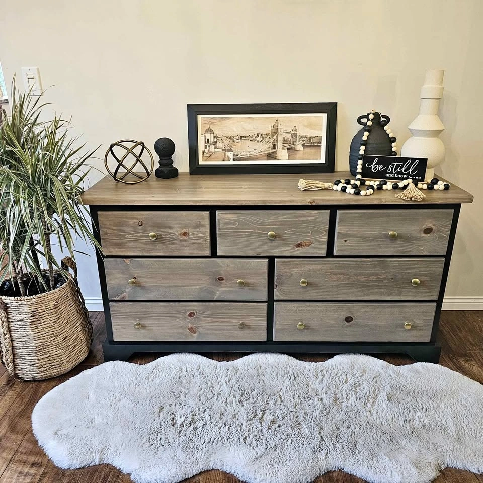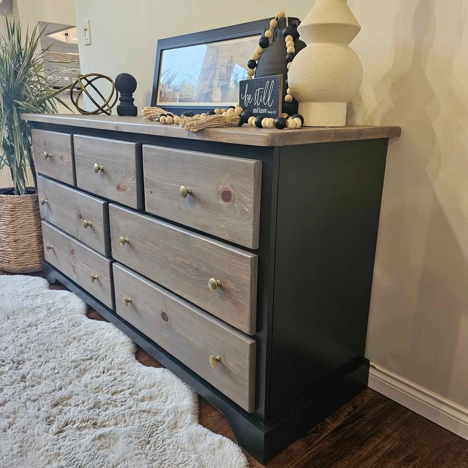 Refinished solid pine wood dresser. Painted in Benjamin Moore's cabinetry paint in the colour Black Beauty with a sprayer for a very smooth finish. The rest has been sanded down and stained with the colour Whole Wheat, a popular brown/grey toned stain, and topped with Diamond Finish Varathane in a Matte finish for durability. The drawers are all on rollers and open and close very smoothly. They feature super thick and solid walls and bottoms that will last a long time. Brand new brass knobs have been added. Dimensions: 58 inches wide, 18 inches deep, and 29.5 inches tall. Check out Upswing Designs on Instagram for more of my creations.