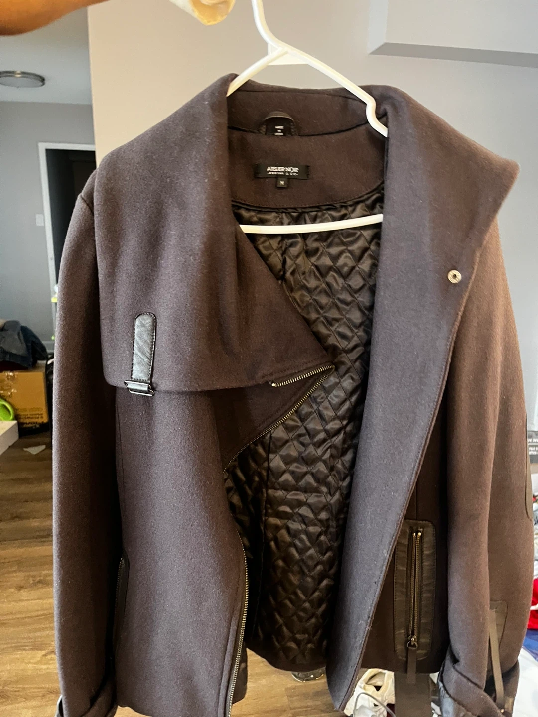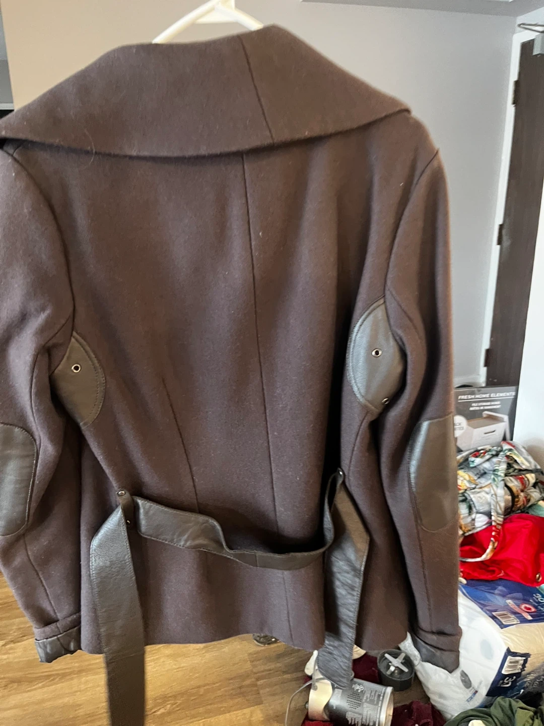 Selling a stylish Azzaro Paris wool blend coat in size M. It's a beautiful dark brown colour with leather accents. Perfect for staying warm and fashionable this season!