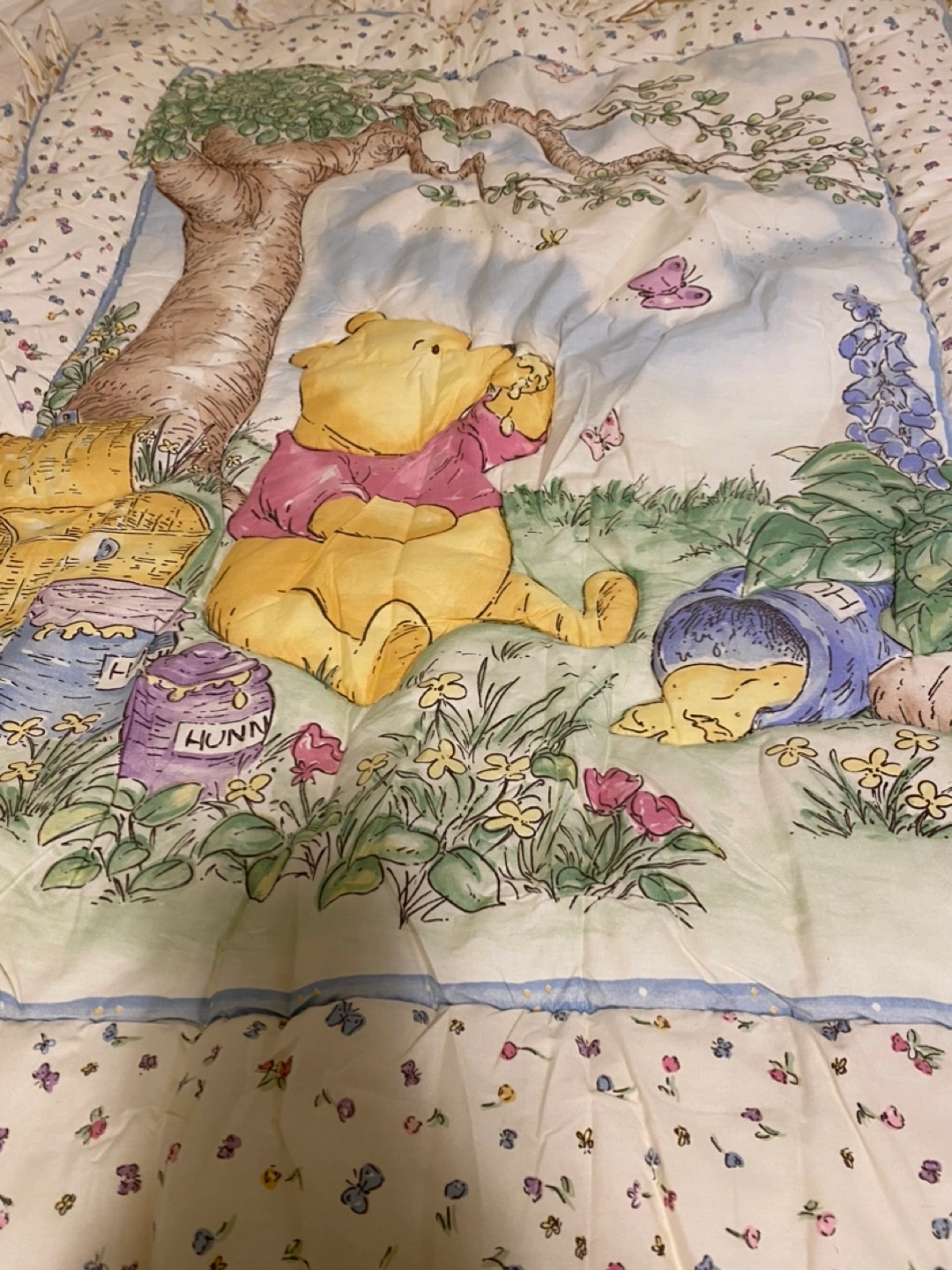 Crib bedding set featuring Winnie the Pooh and friends. Includes a quilt, bumper, fitted sheet, skirt and wall hangings. Was put on crib and not used. Was stored away.