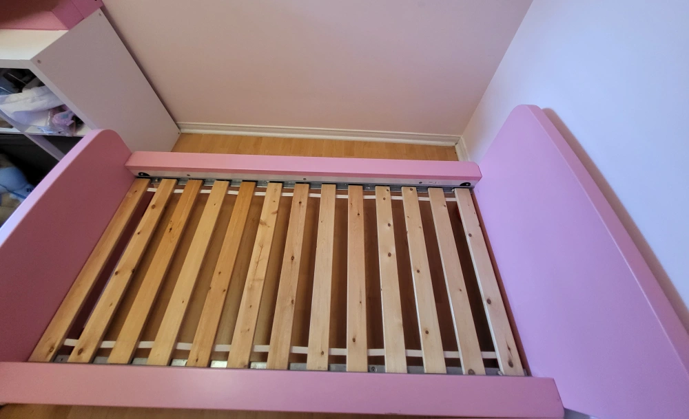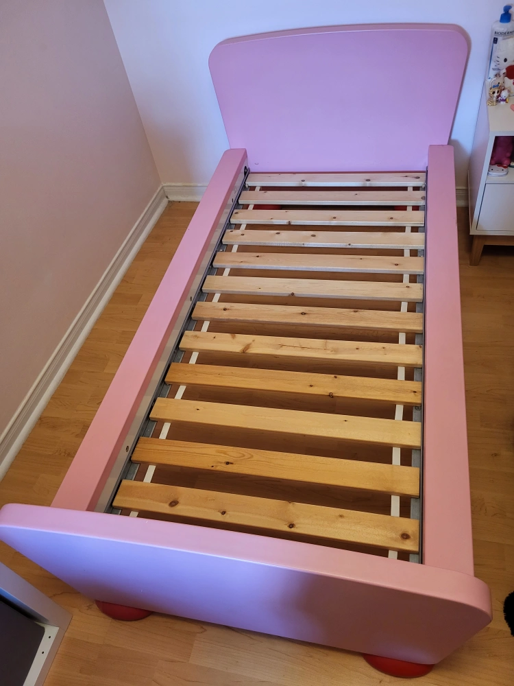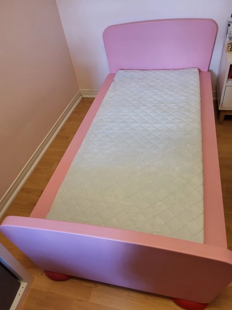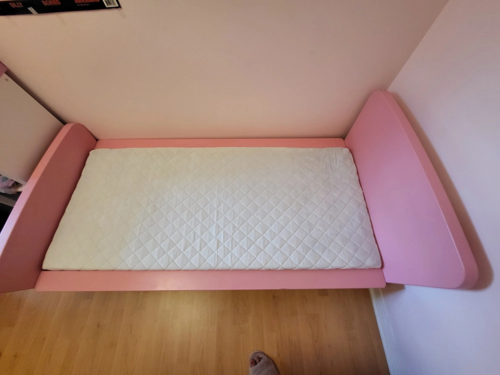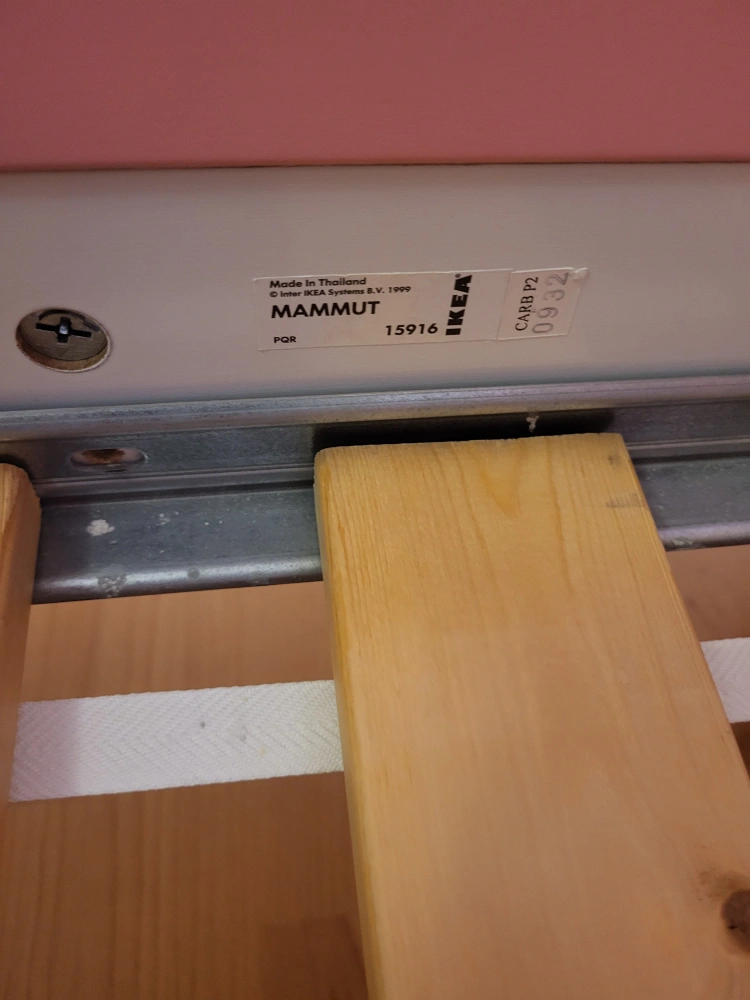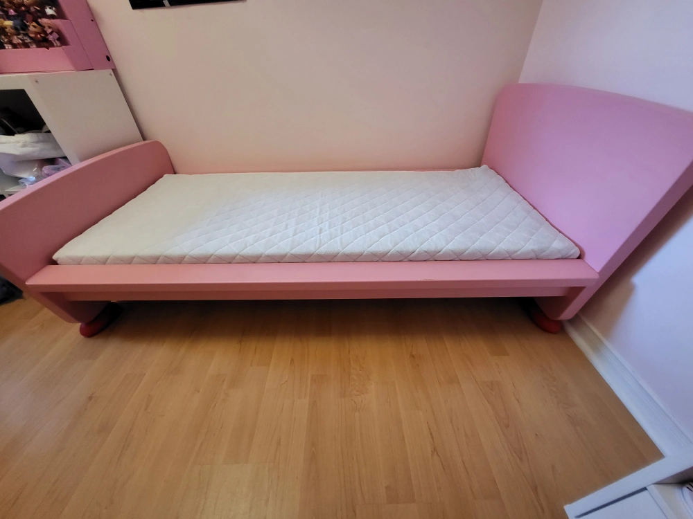 Mammut brand - Ikea, toddler bed with mattress. Vyssa brand mattress cover included. Already disassembled for easy transport. Pickup only. If it's listed free then it's available. Just ask for the address and pick it up. First come first get basis. Read the description, IT IS A CHILD'S BED. I DON'T HAVE ALL THE TIME TO ANSWER SILLY QUESTIONS.