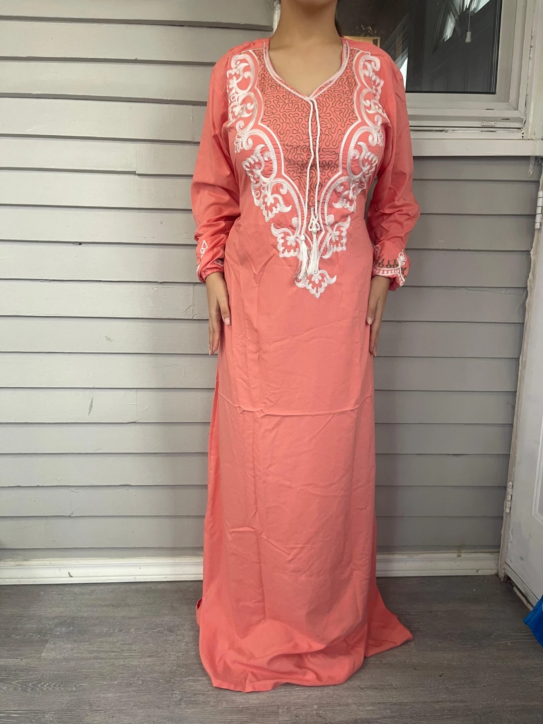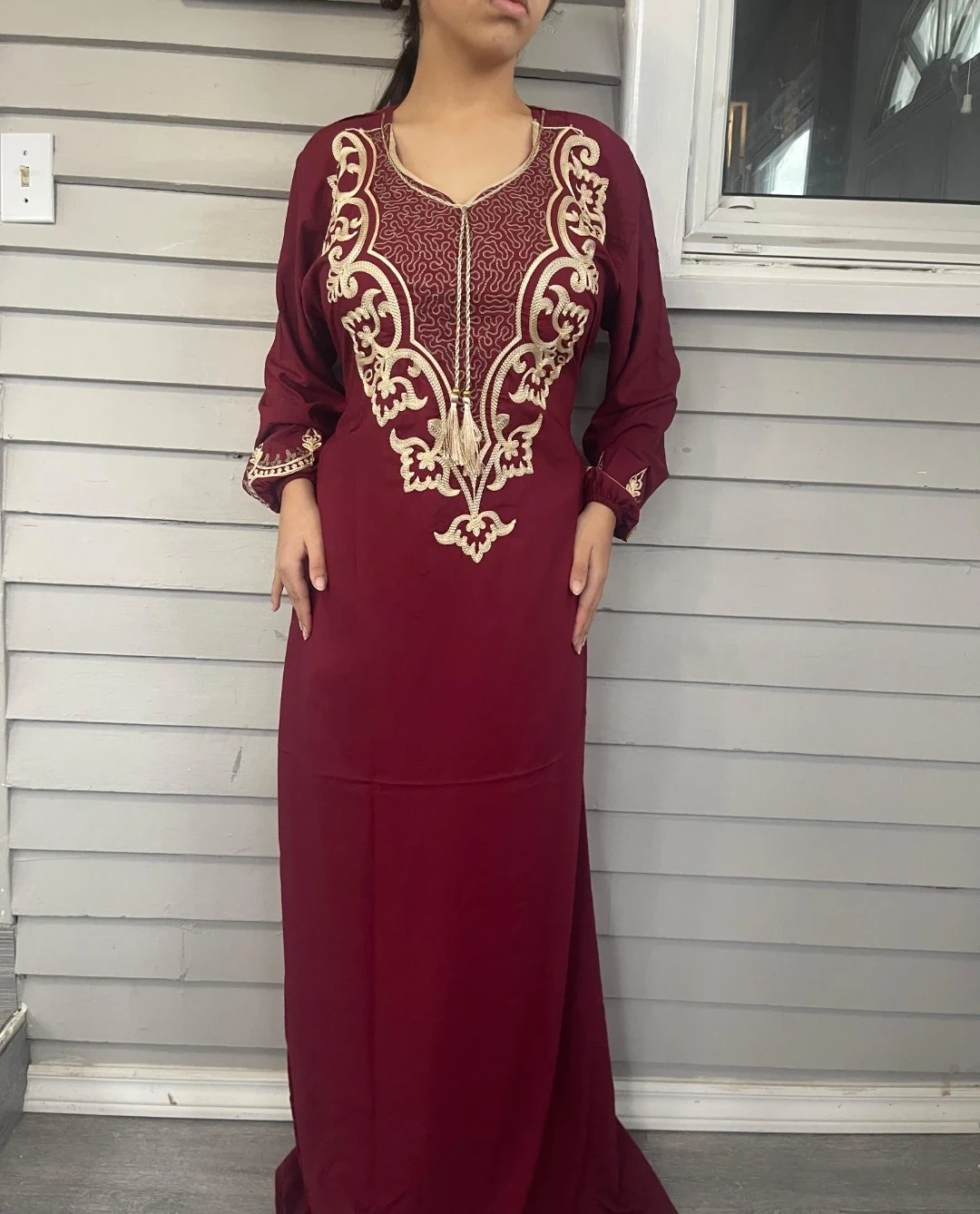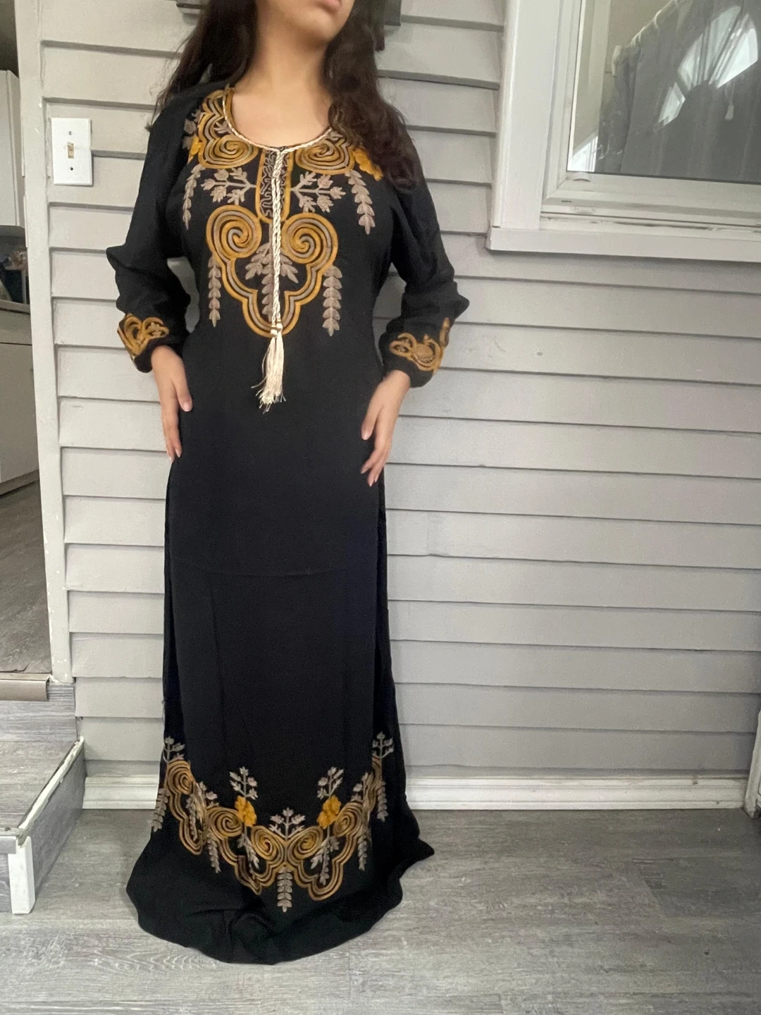 Flowy, long-sleeved kaftan dress with intricate gold embroidery. Features a v-neckline with tassel detail. Available in multiple colours. Perfect for special occasions or everyday elegance!
