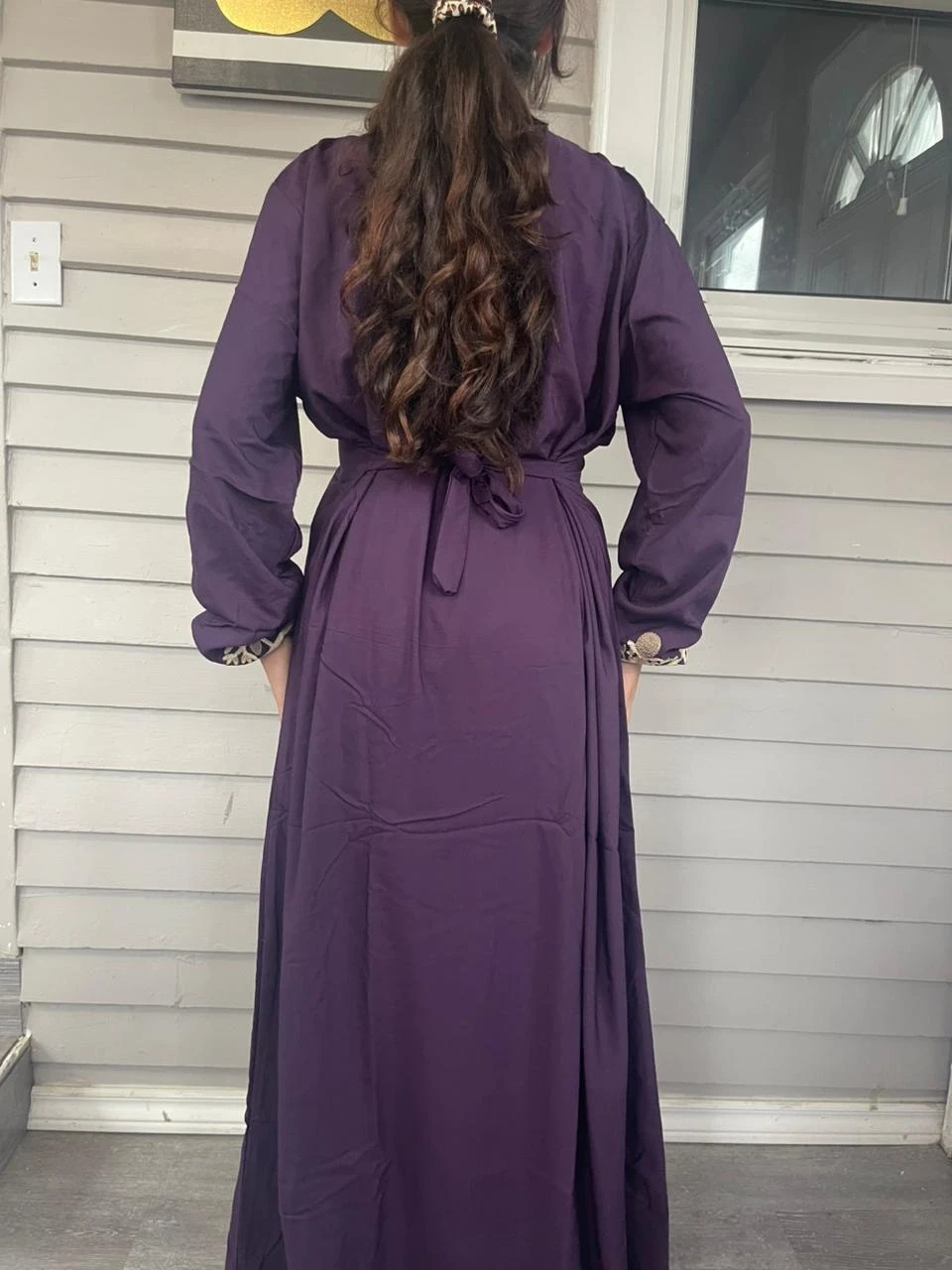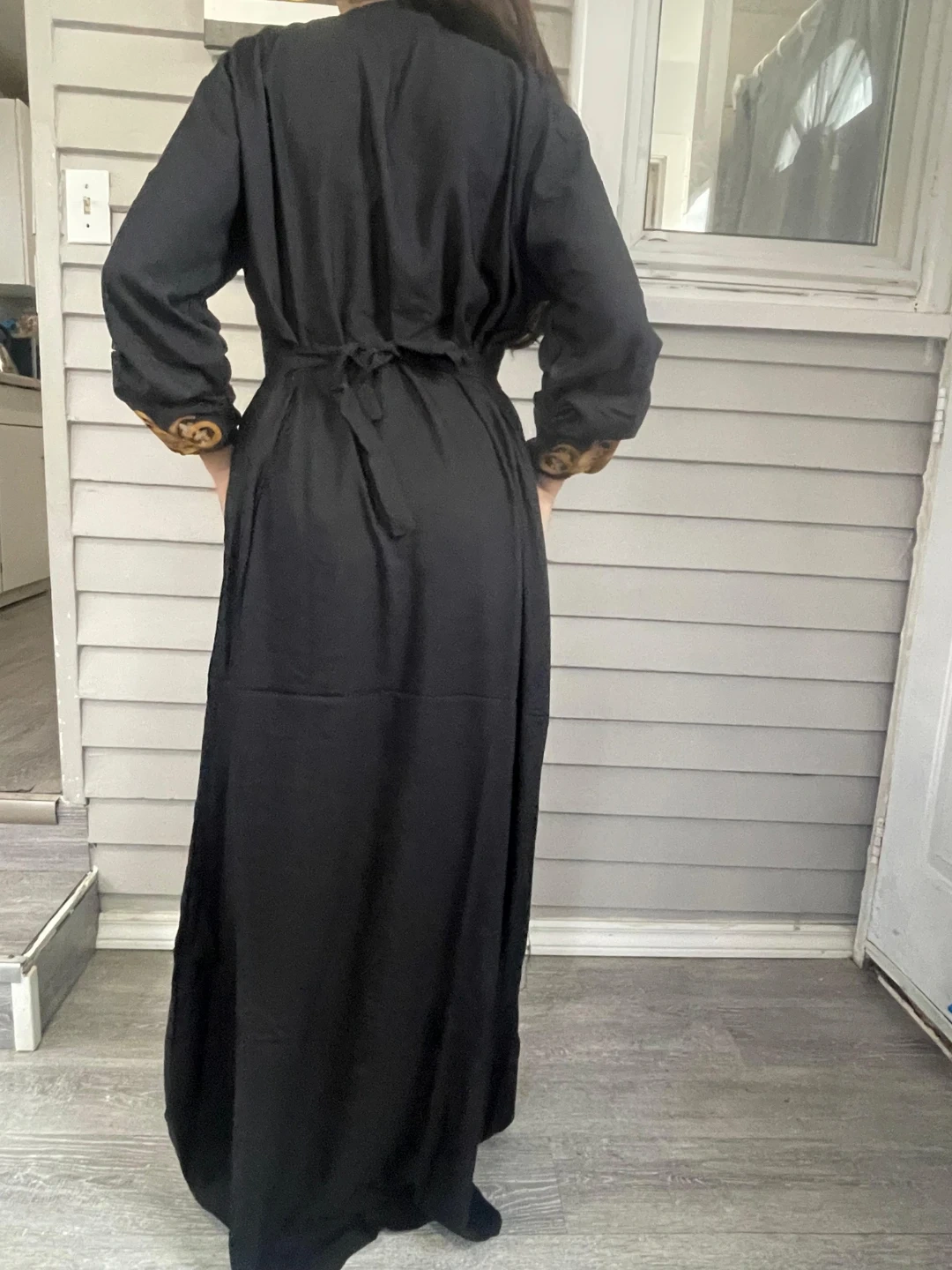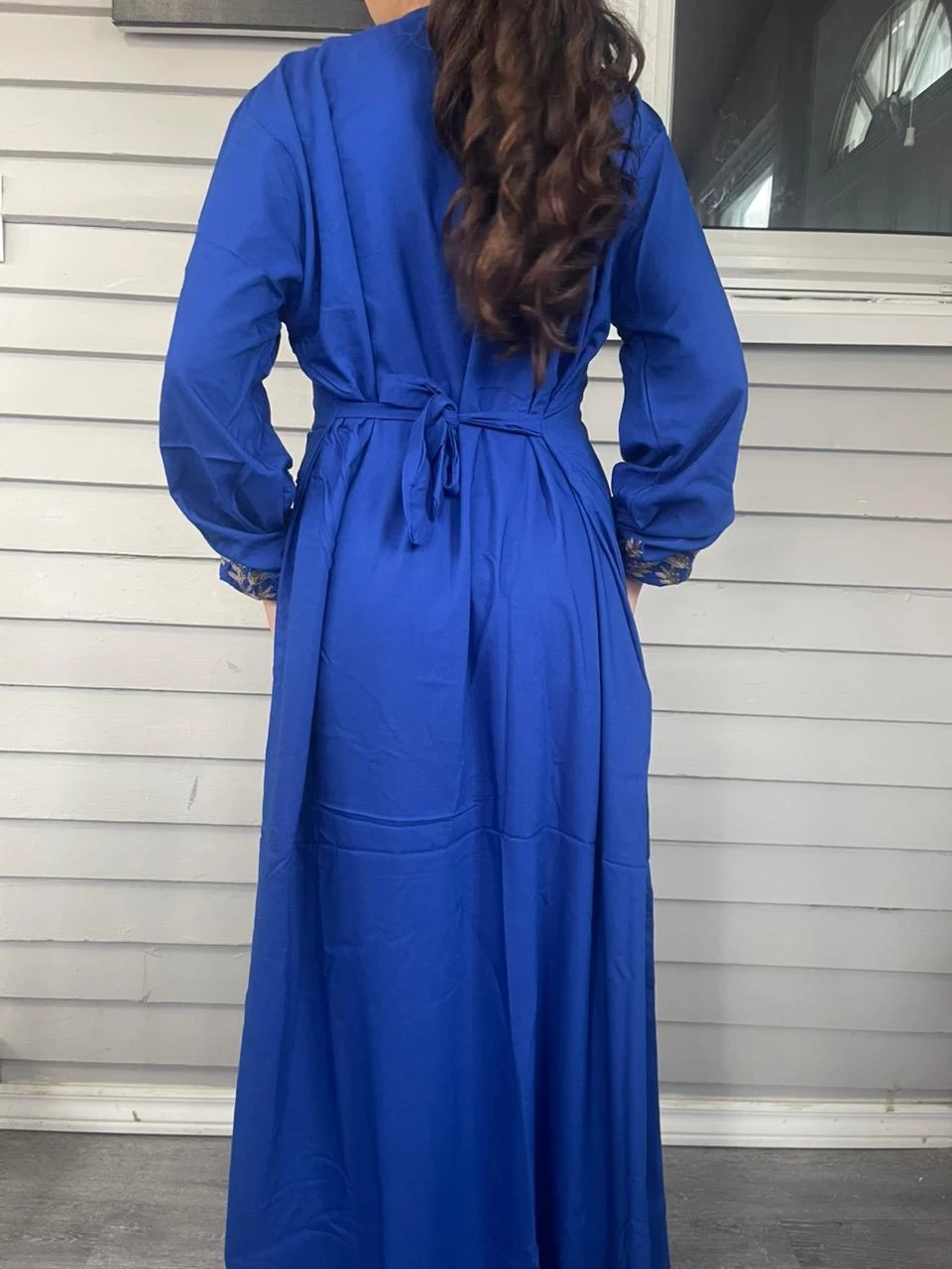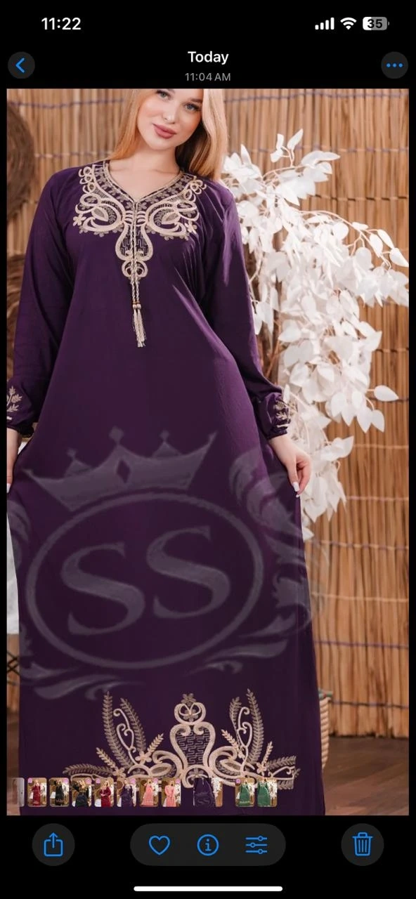 Flowy, long-sleeved kaftan dress with intricate gold embroidery. Features a v-neckline with tassel detail. Available in multiple colours. Perfect for special occasions or everyday elegance!