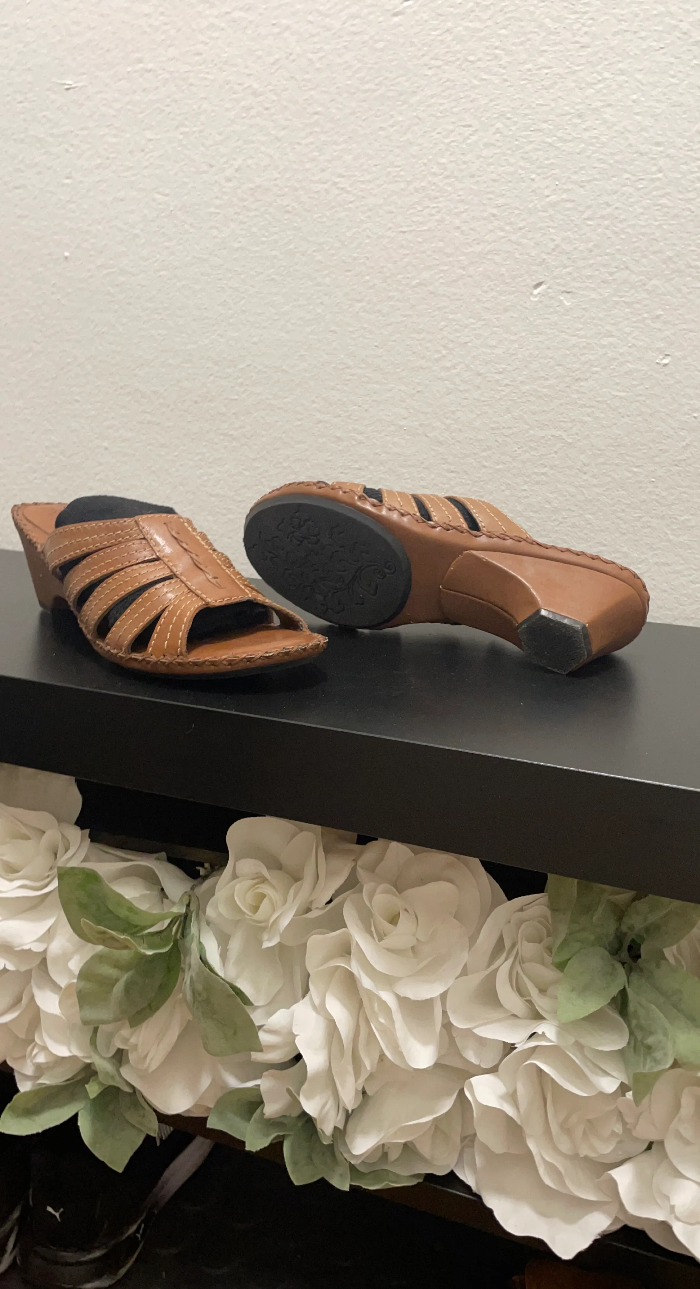 White Mountain Slide-on wedge mules with a woven leather upper. Heel height appears to be approximately 2 inches. These are a stylish and comfortable option for everyday wear. Perfect for warmer weather! Worn ONCE!!