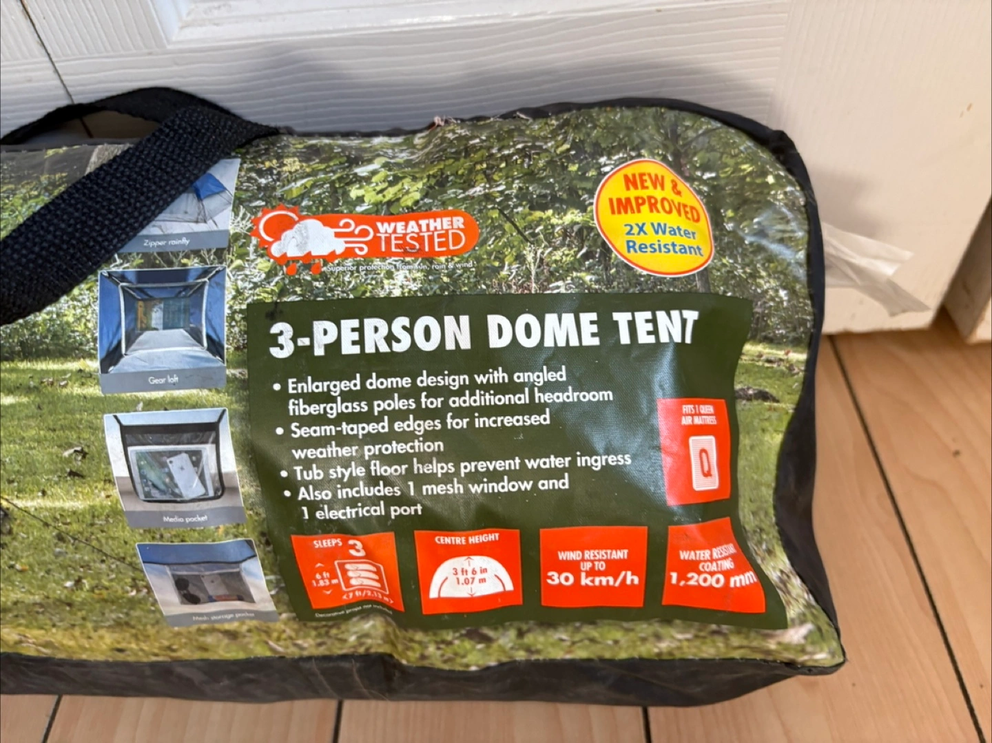 Selling a 3-person dome tent in great condition! It's weather-tested and features an enlarged dome design with angled fiberglass poles for additional headroom. The seam-taped edges offer increased weather protection, and the tub-style floor helps prevent water from getting in. Also included is one mesh window and one electrical port