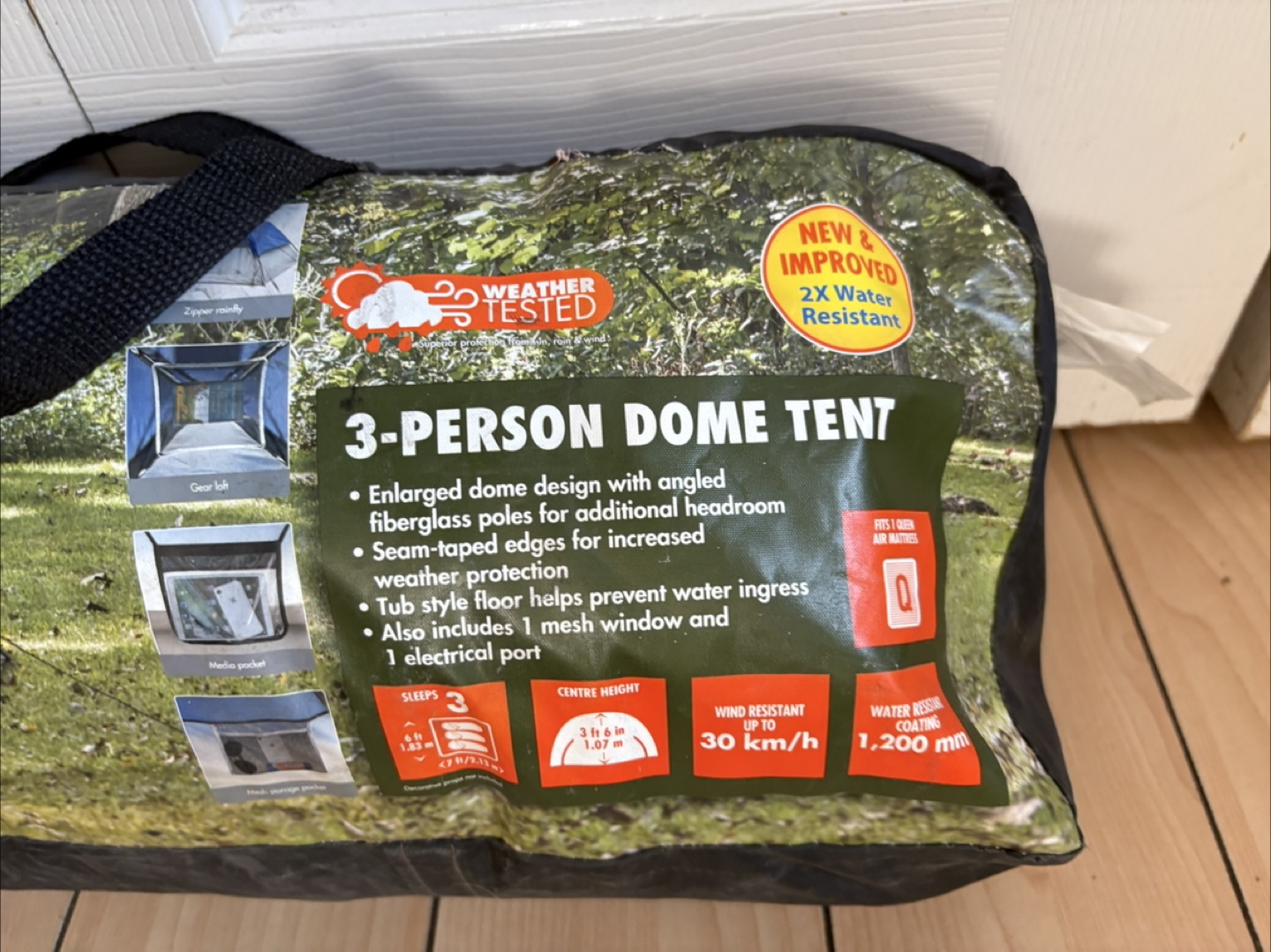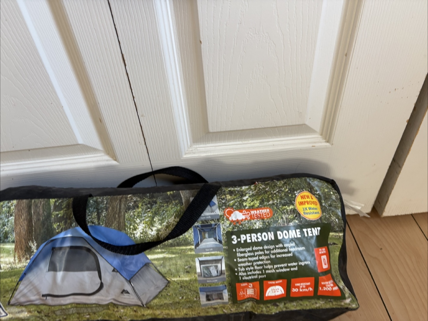 Selling a 3-person dome tent in great condition! It's weather-tested and features an enlarged dome design with angled fiberglass poles for additional headroom. The seam-taped edges offer increased weather protection, and the tub-style floor helps prevent water from getting in. Also included is one mesh window and one electrical port