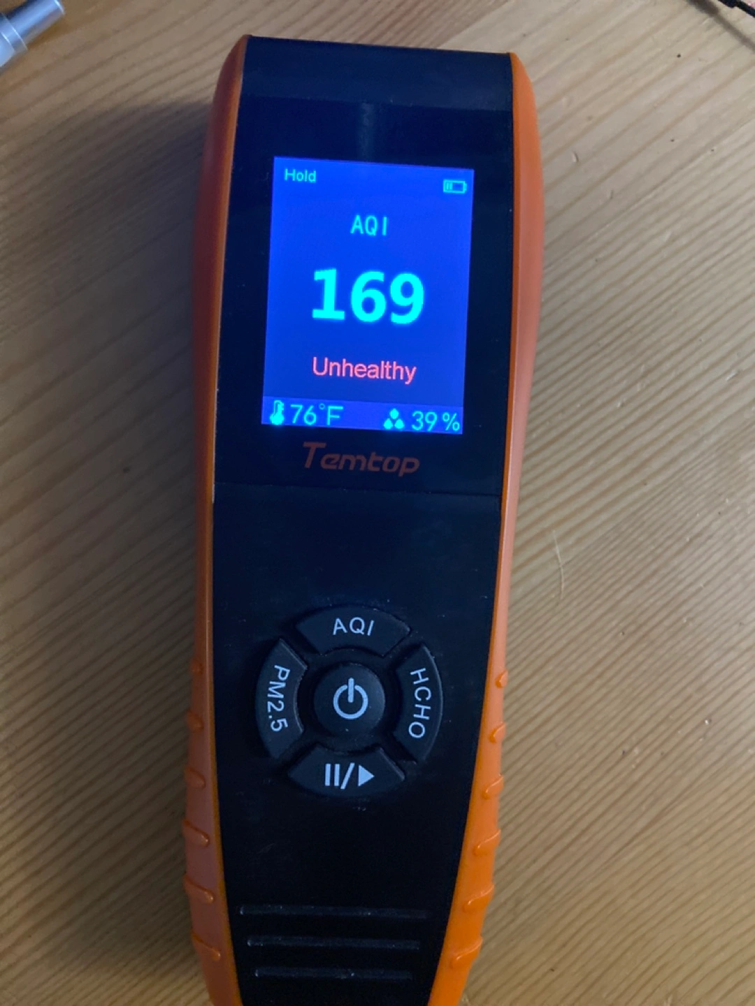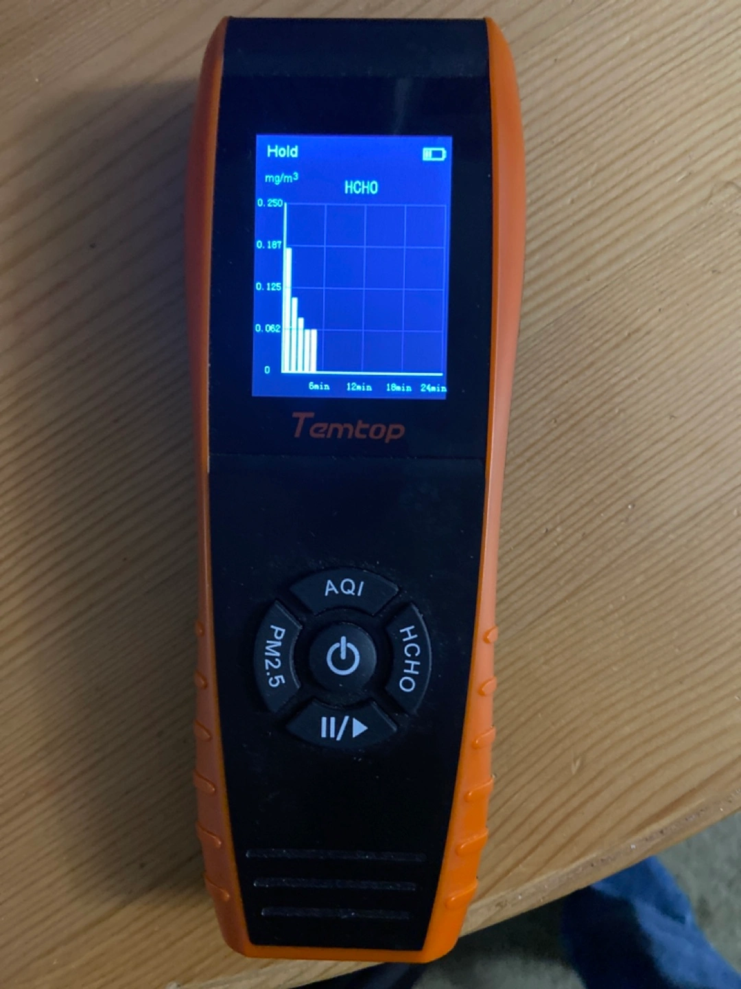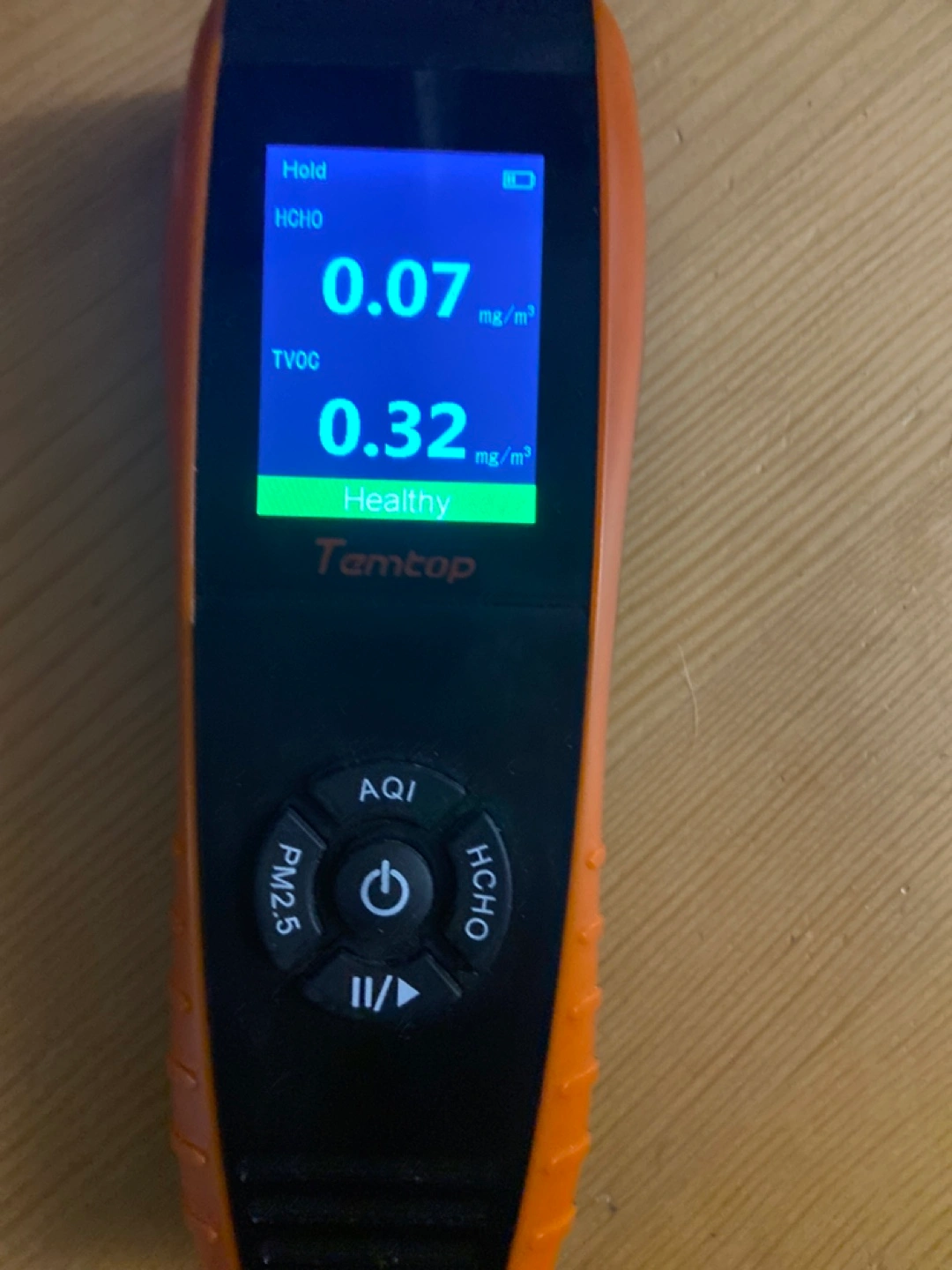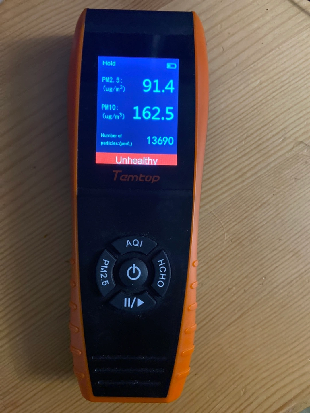 Portable air quality monitor. Measures PM2.5, PM10, HCHO, TVOC, and AQI. Orange handheld device with a digital display. Shows readings in real-time. Includes different measurement modes.