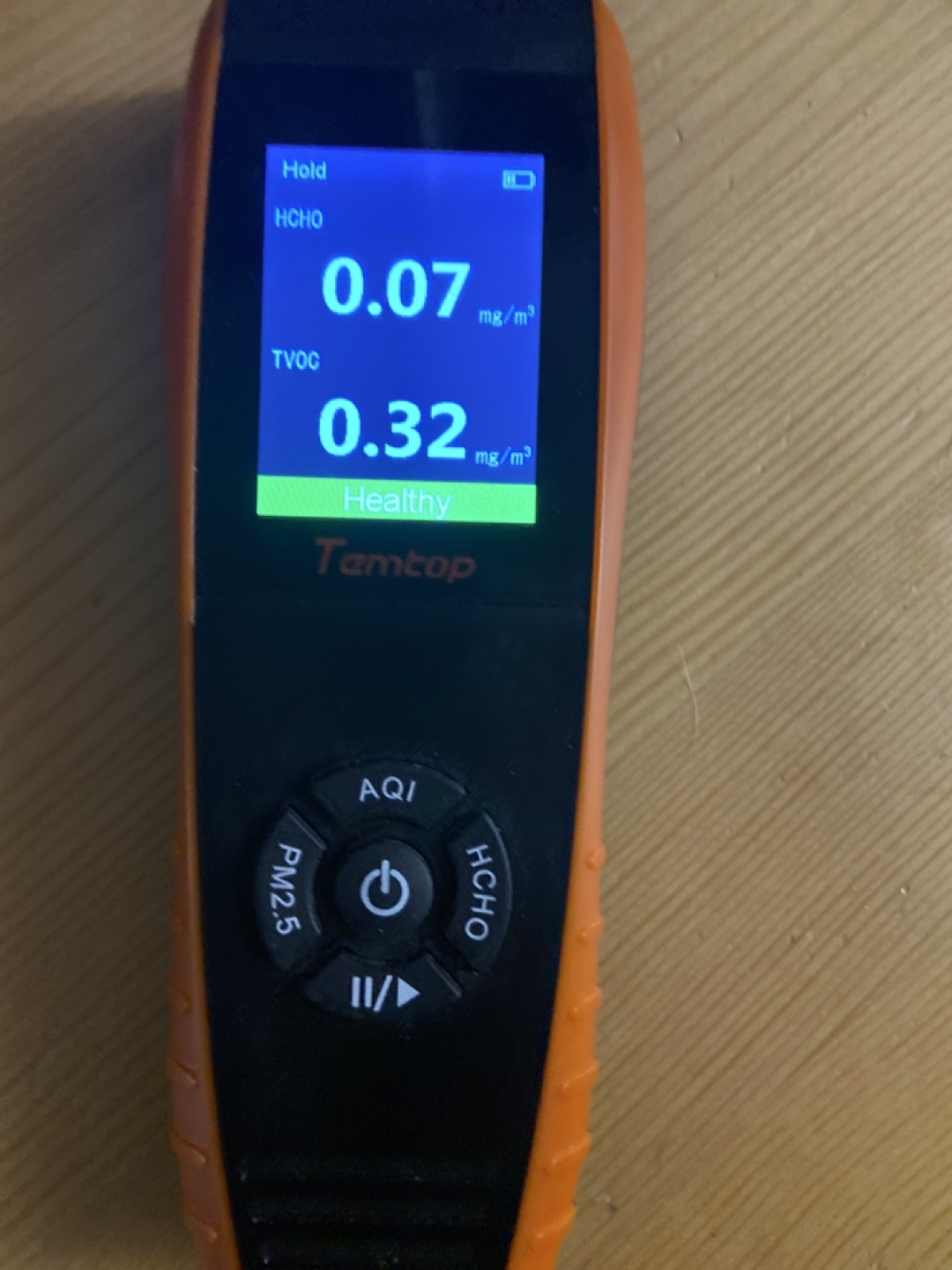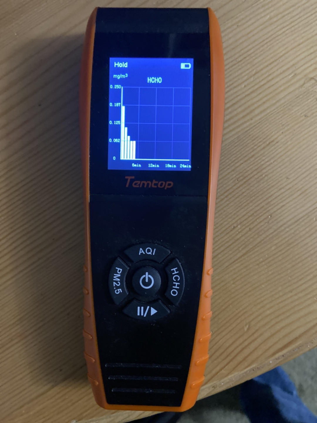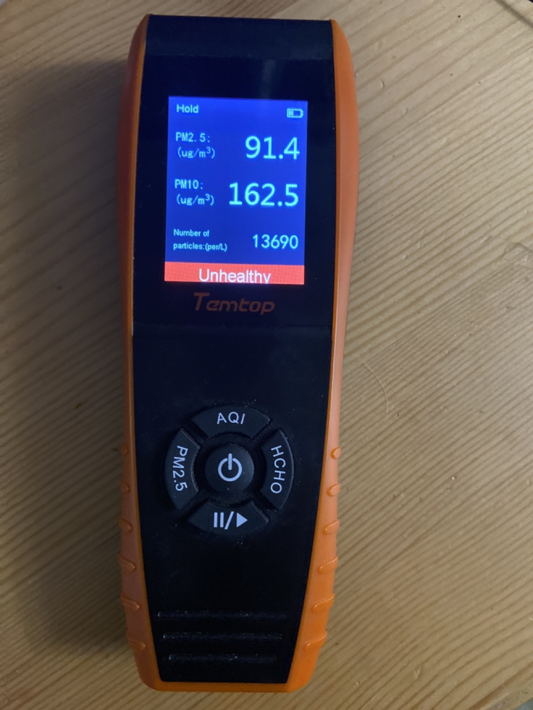 Portable air quality monitor. Measures PM2.5, PM10, HCHO, TVOC, and AQI. Orange handheld device with a digital display. Shows readings in real-time. Includes different measurement modes.