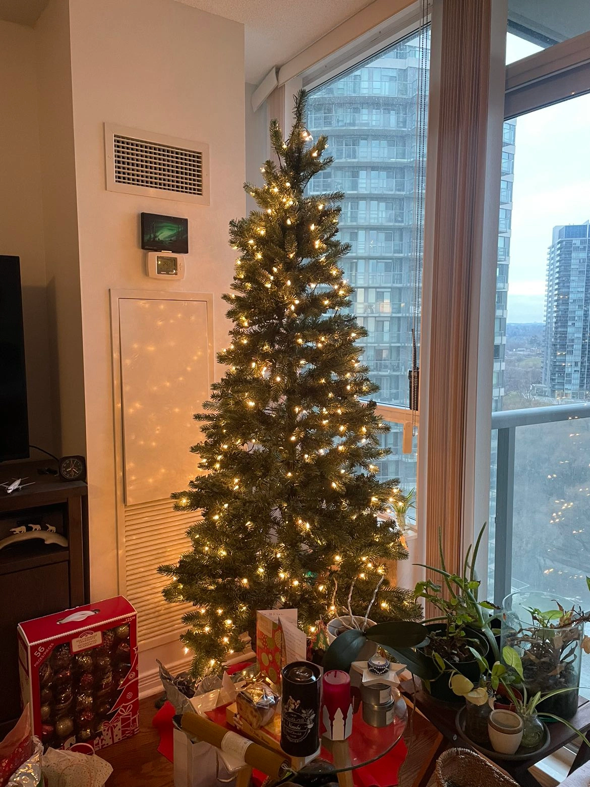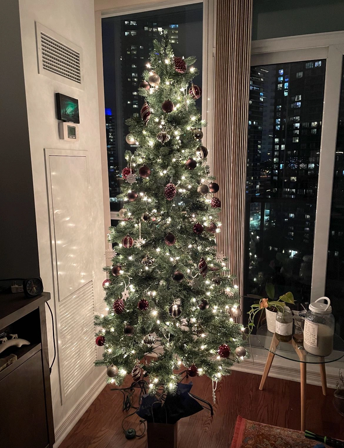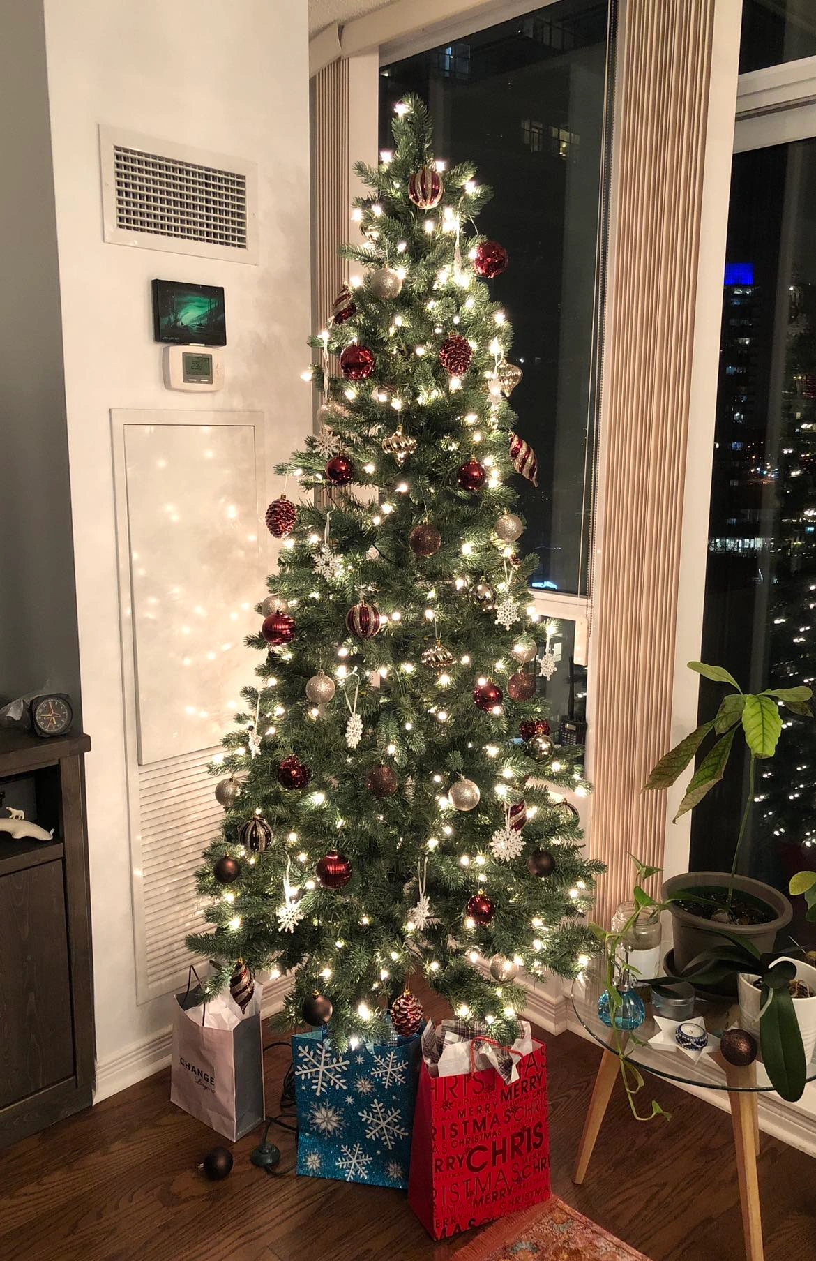 NOMA tall slim pre lit light Christmas tree with red decorations.