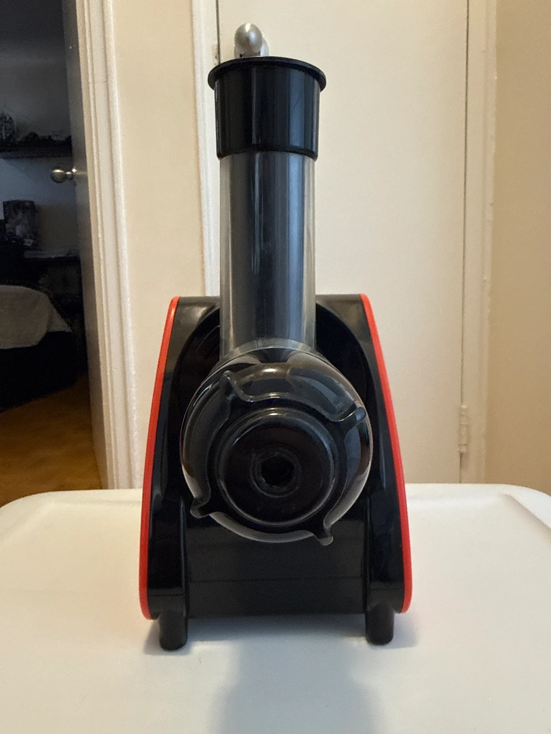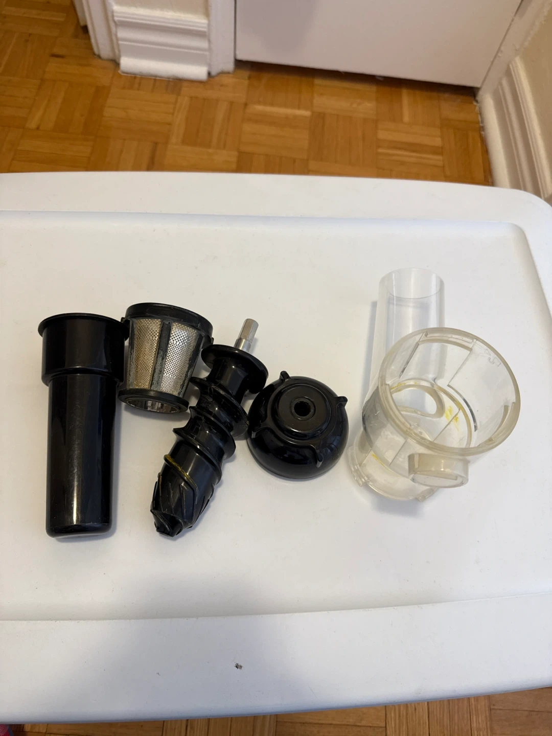 This Homever slow juicer is black and red. It comes with all the parts shown in the image. Makes fresh juice quickly!