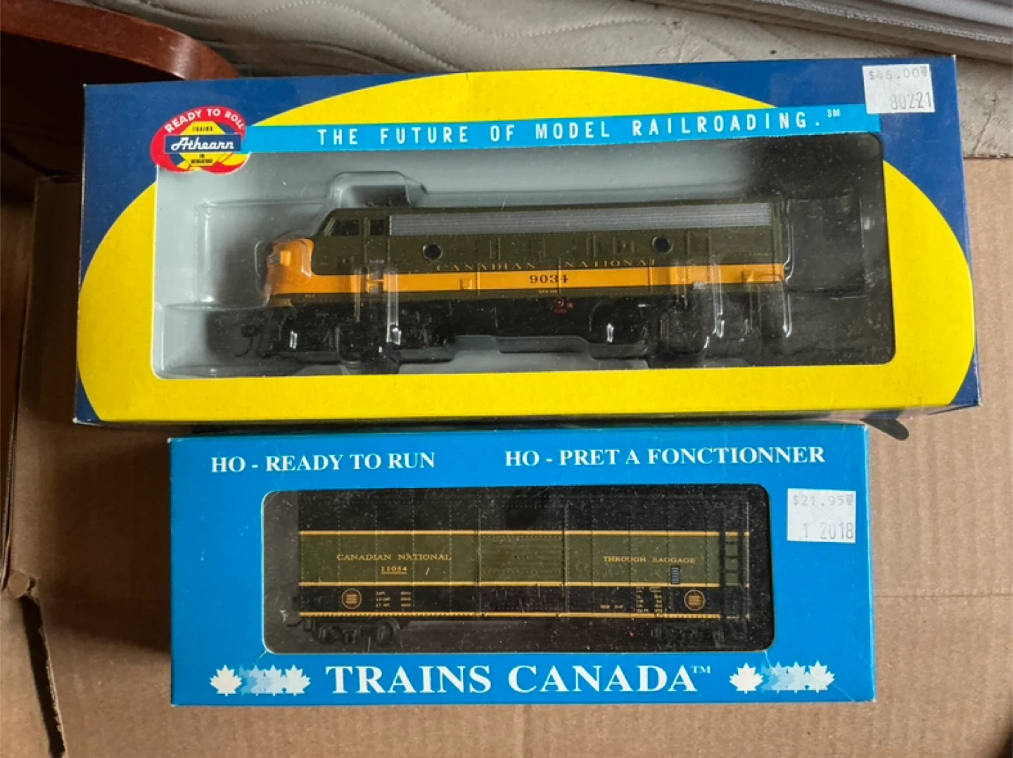 10Selling two HO scale trains: an Athearn locomotive and a Trains Canada baggage car, both in Canadian National Railway theme. The locomotive is marked 9034 and the baggage car is 11054. The locomotive originally sold for $46 and the baggage car for $21.95
