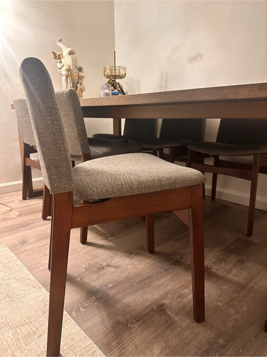 Selling a set of 6 Article Nosh dining chairs! They feature a cozy gray fabric and a walnut wood frame. The chairs are New in the box, and ready to add a touch of modern style to your dining space. The size of each chair is 745 x 555 x 1135 mm. Boxes included