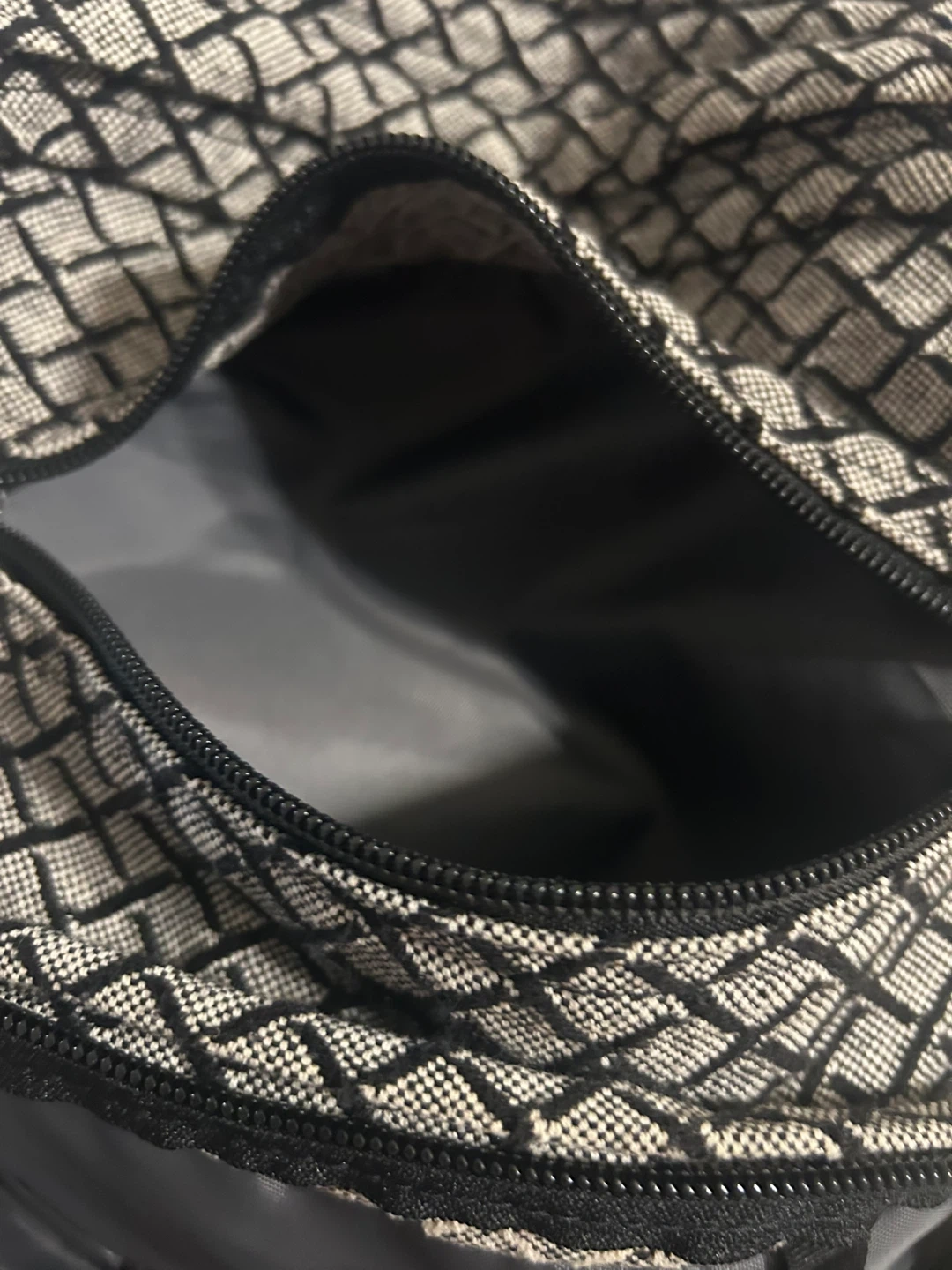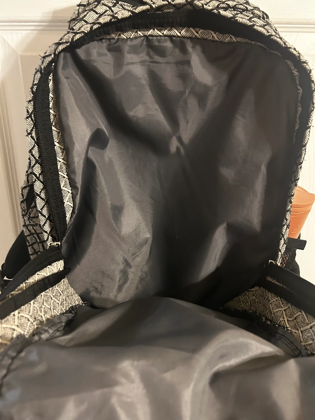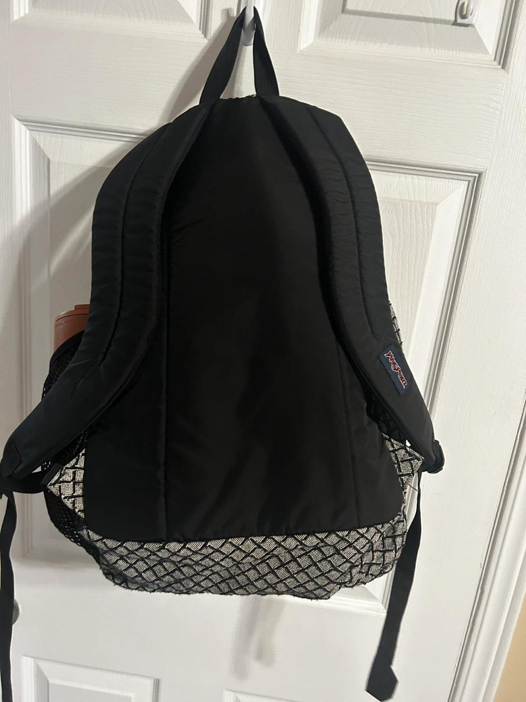 This JanSport backpack is black with a grey diamond pattern. It has multiple zippered compartments and a side mesh pocket. It's great for school or everyday use!