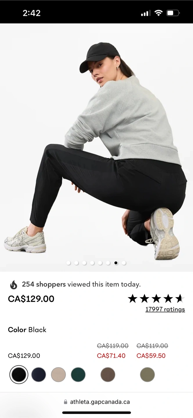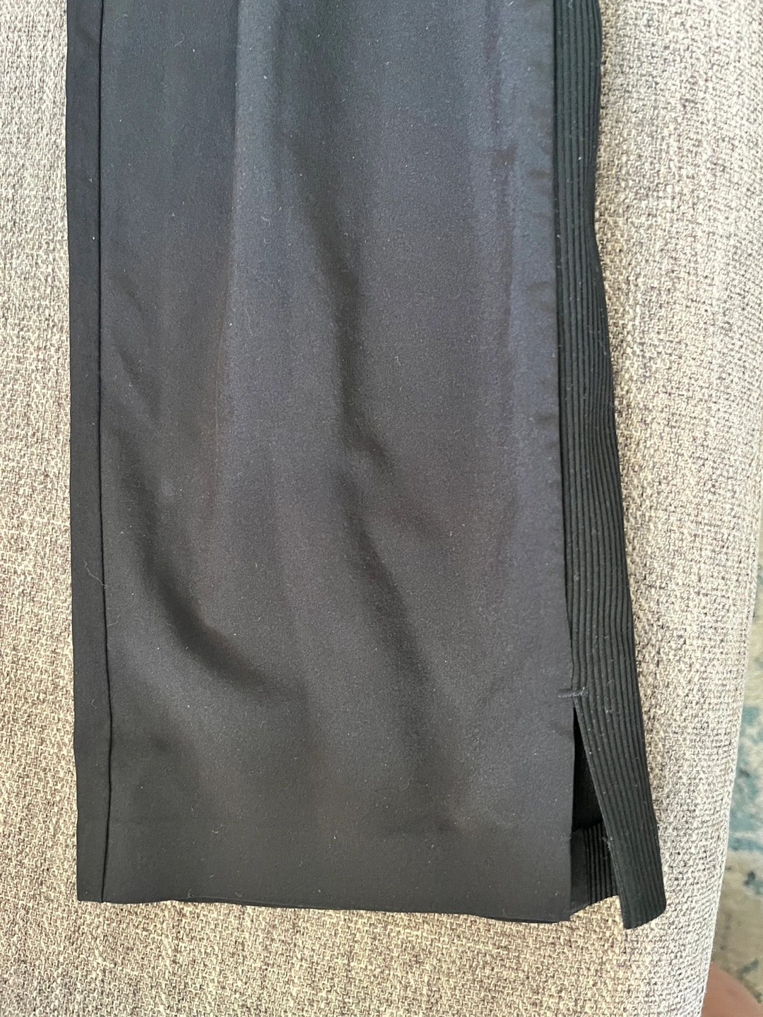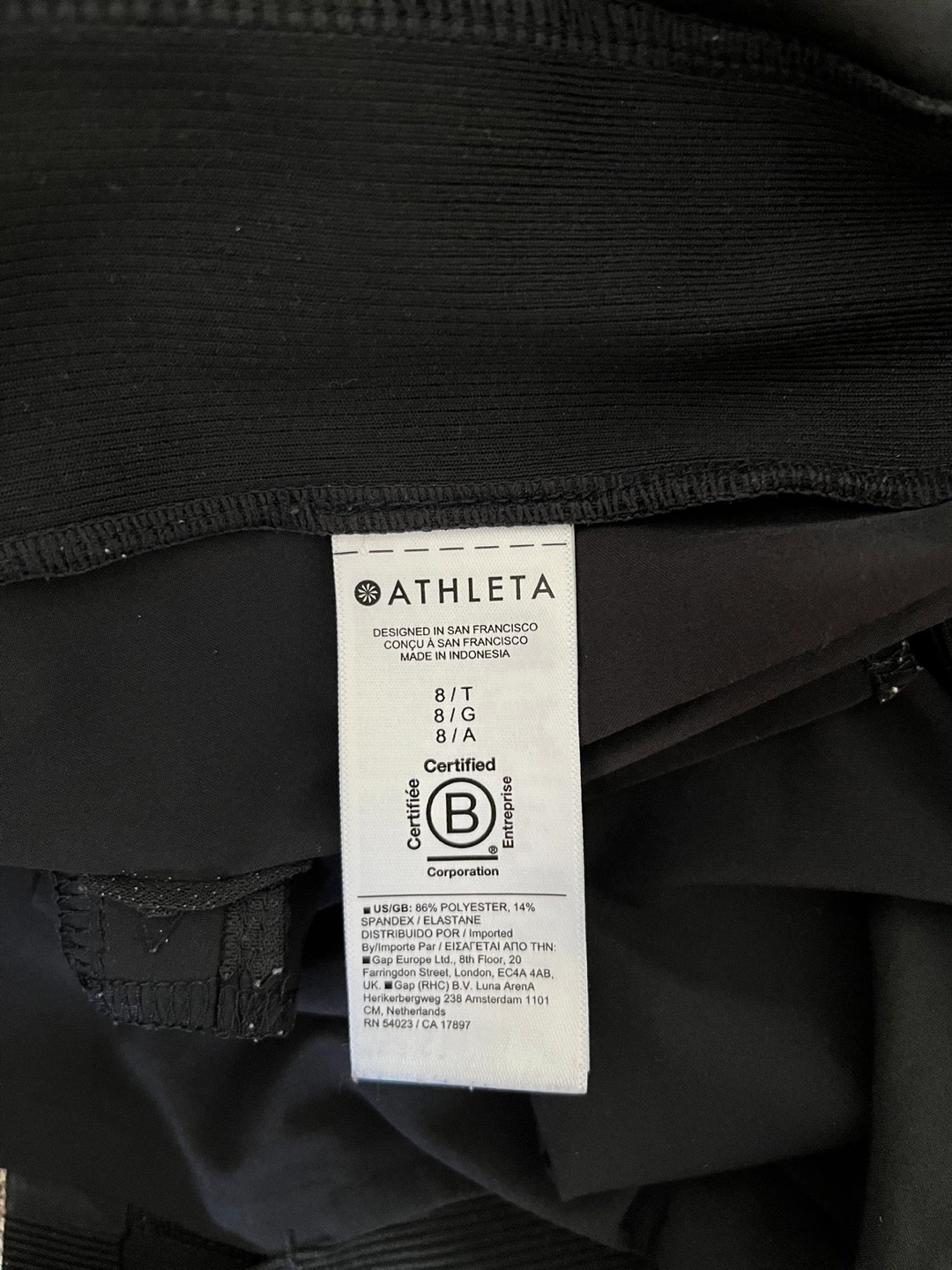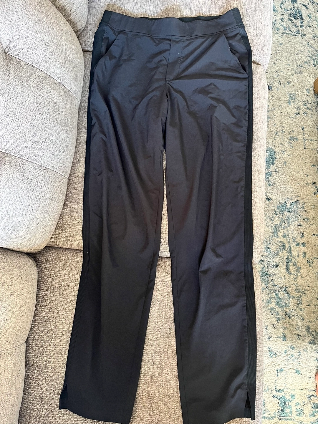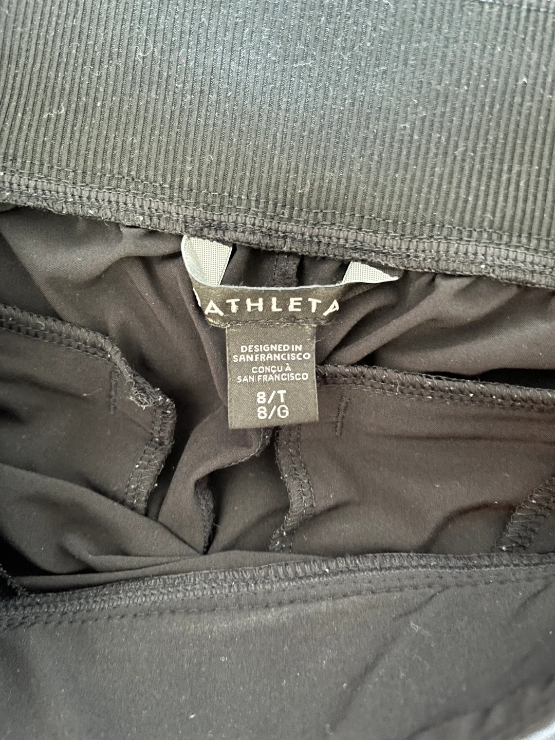 These are a pair of Athleta black pants, size 8/T. They are made of a comfortable, flexible material, perfect for workouts or everyday wear. The pants have a sleek design with subtle ribbed detailing on the sides. They're in great condition and ready for a new home!