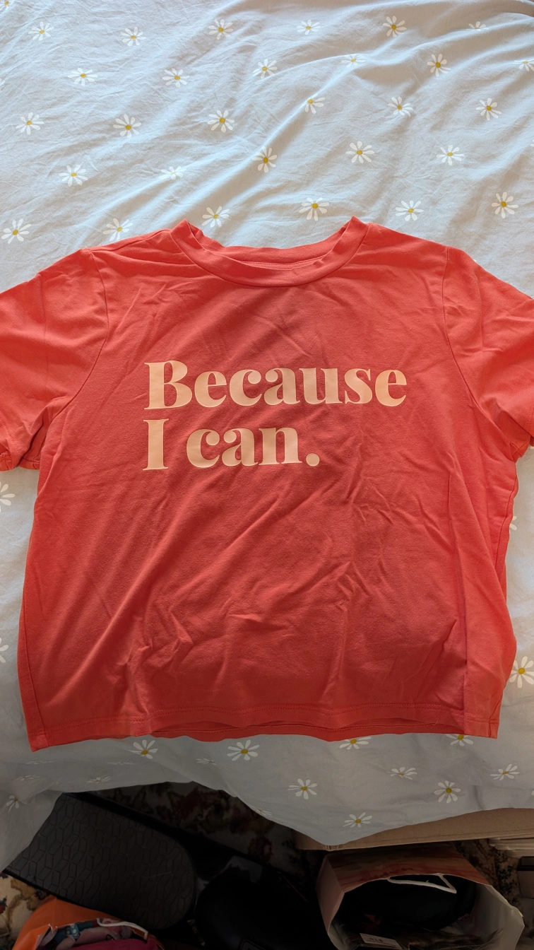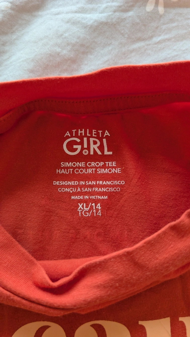 Selling an Athleta Girl Simone Crop Tee in size XL (14 kids). The shirt is in a bright orange colour and features the phrase "Because I can" on the front. The back has Athleta and Simone Biles written with small icons below. Great for active kids!