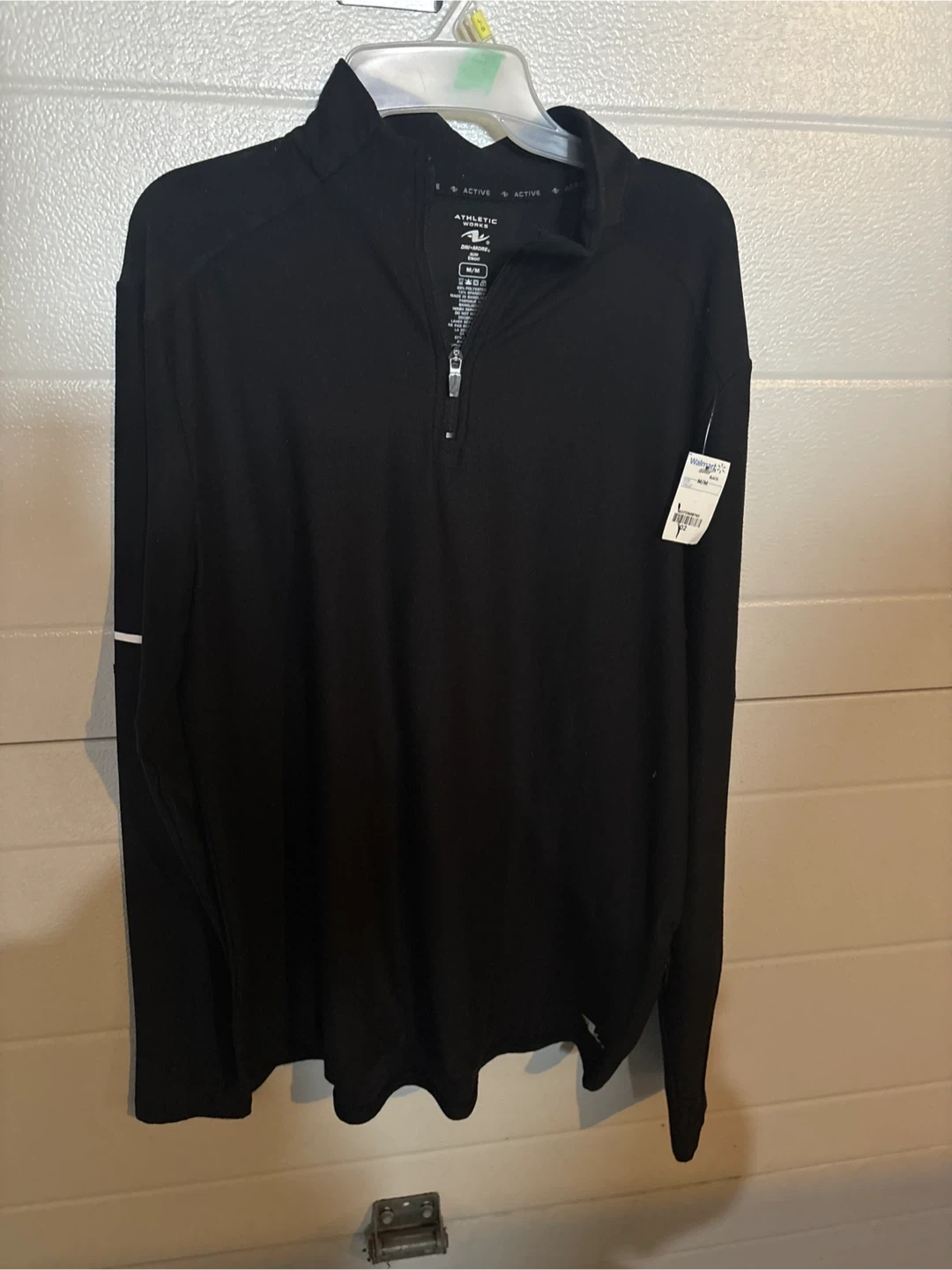60Selling a black Athletic Works pullover in size medium. It's in great condition and perfect for workouts or casual wear! The material is comfortable and breathable, making it ideal for active days. It has a quarter-zip design and a sleek, sporty look