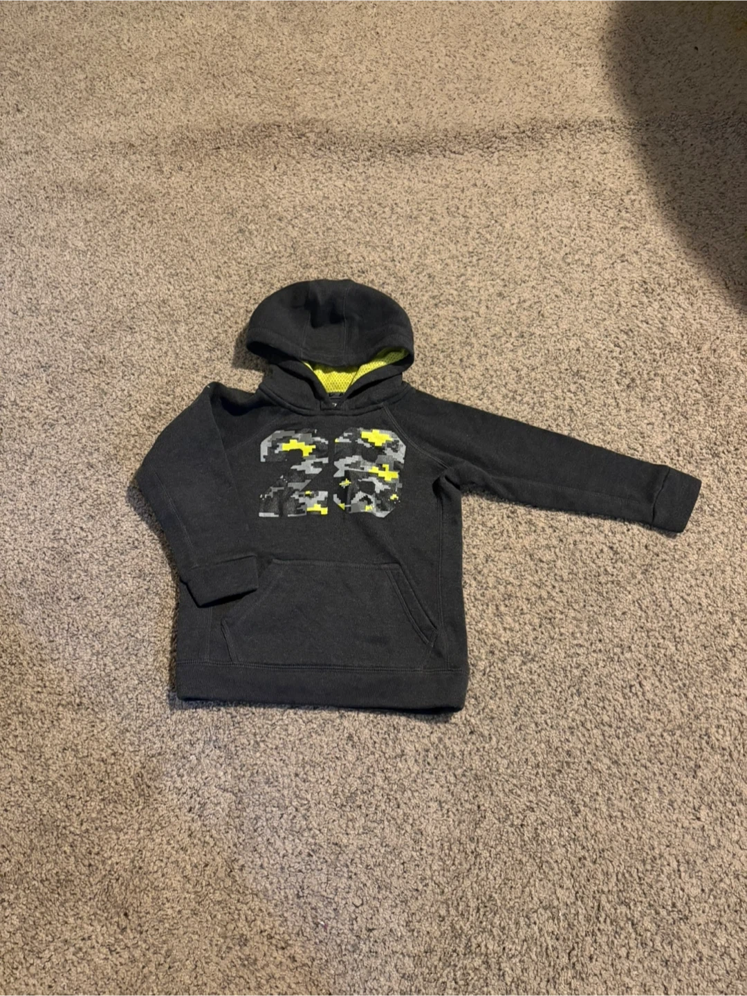 15Cozy Athletic Works hoodie for kids, size 4T. dark grey colour with a cool '23' design on the front. inside of the hood is a bright yellow mesh material.