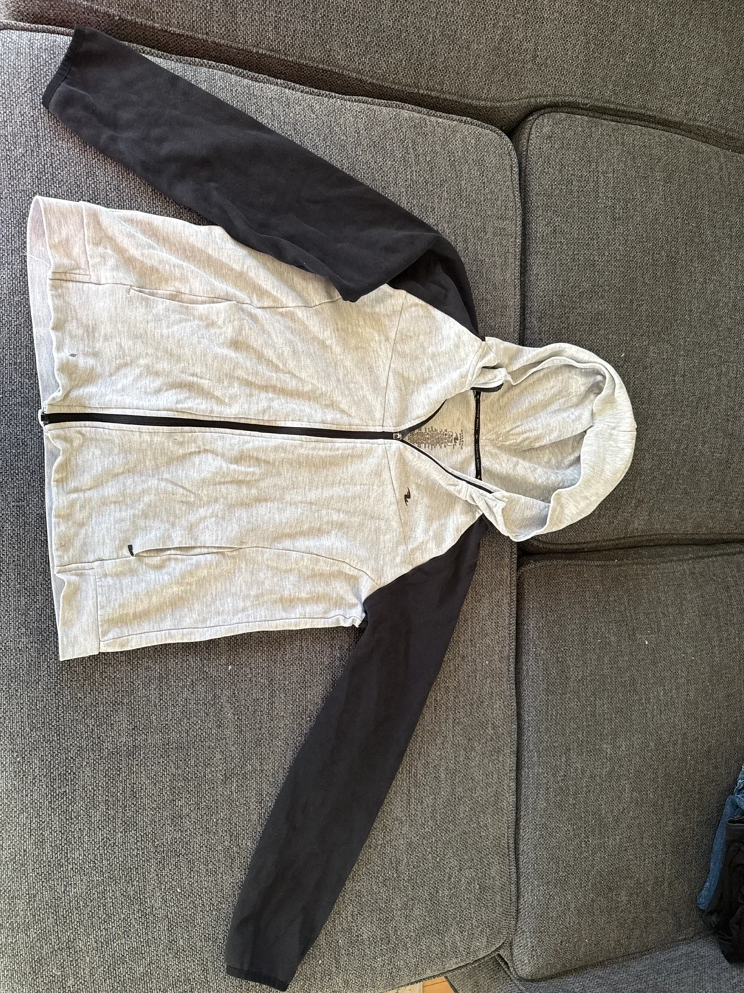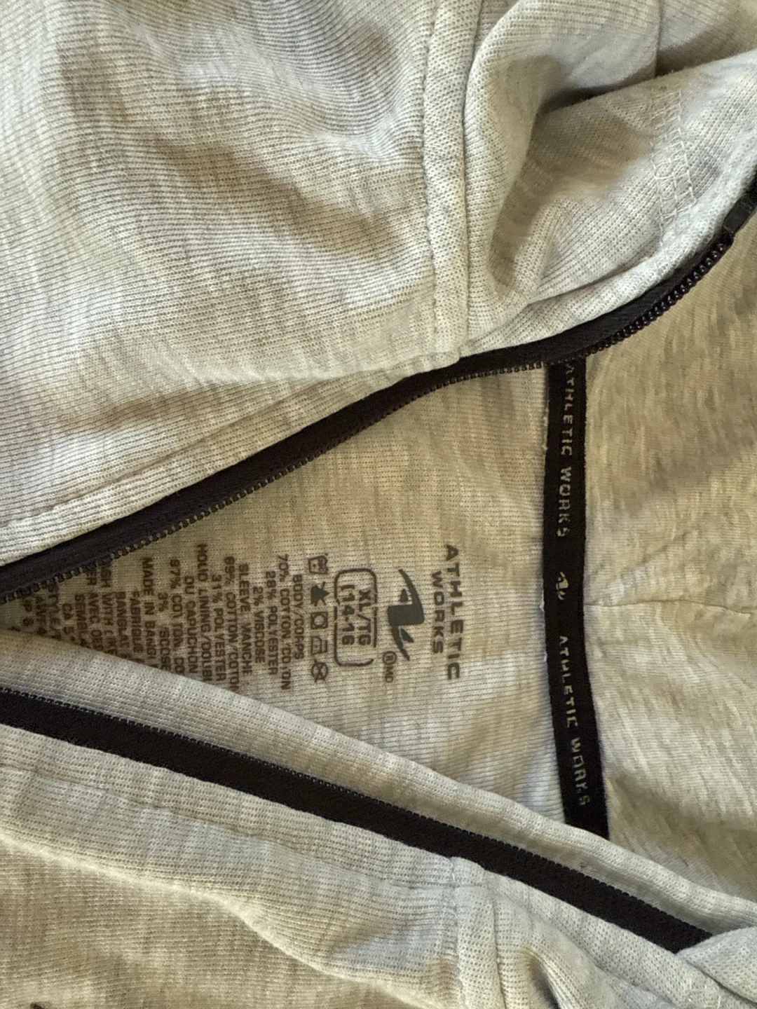 29Athletic Works hoodie in size XL/TG. It features a grey body and black sleeves. The material is a blend of cotton, polyester, and viscose.