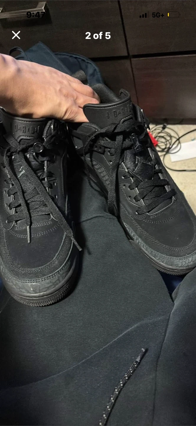 These are Jordan Spizike Low sneakers in a black and anthracite colorway. They feature a mix of suede and synthetic materials. These shoes are a men's size 8.