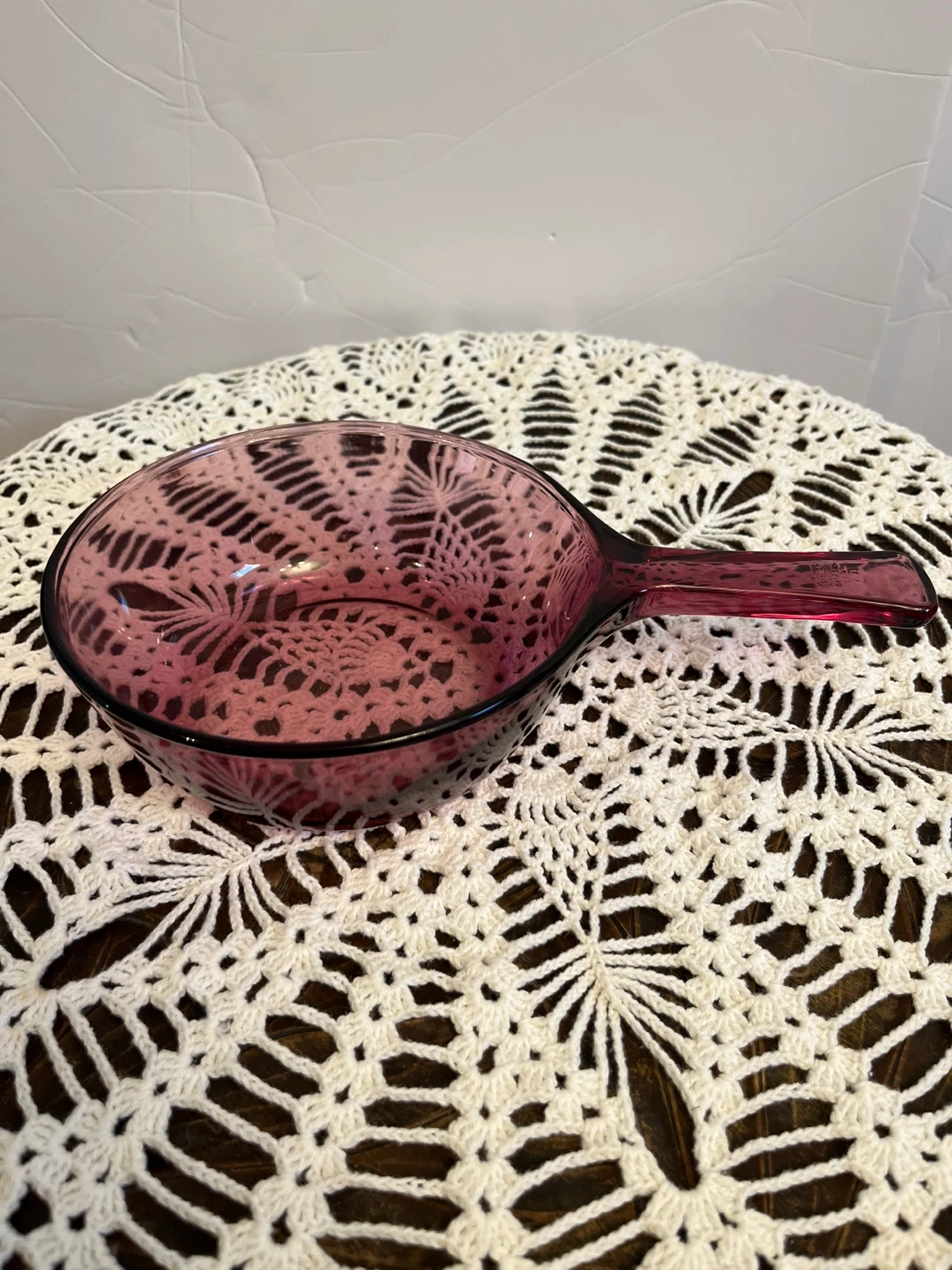 This is a lovely purple glass casserole dish. It features a single handle for easy carrying. The glass material is durable and easy to clean. It's perfect for baking small casseroles or desserts! Corning ware Visio saucepan